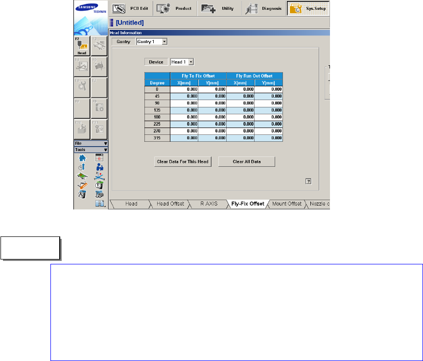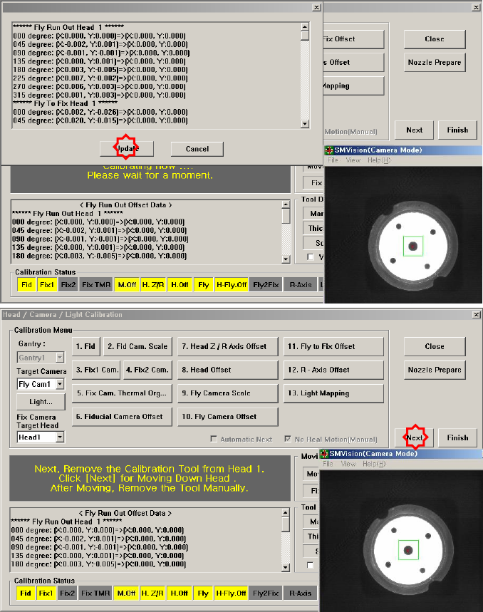 The reference values for the calibration of the Fly to Fix Offset is as follows. Offset X : -0.050 ~ 0.05 0(mm) Offset Y : -0.050 ~ 0.050(mm) The reference values for the calibration of the Fly to Fix Offset is as fo…