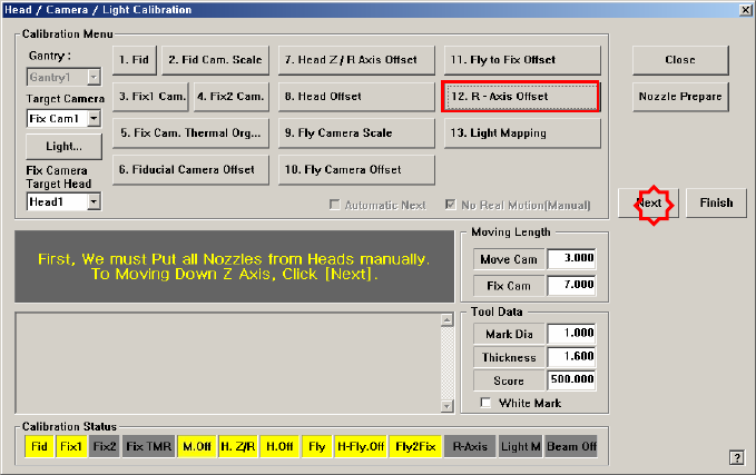 appears. Click the <Next> button to move down the Z axis of the head in order