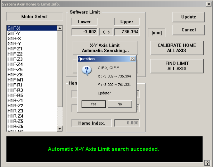 <FIND LIMIT ALL AXIS> button Finds the Limits of all axes. <Home Info.> Group If the mirror axis is selected, the <Home Offset> edit box will be enabled. It is used to perform calibration for the mi…