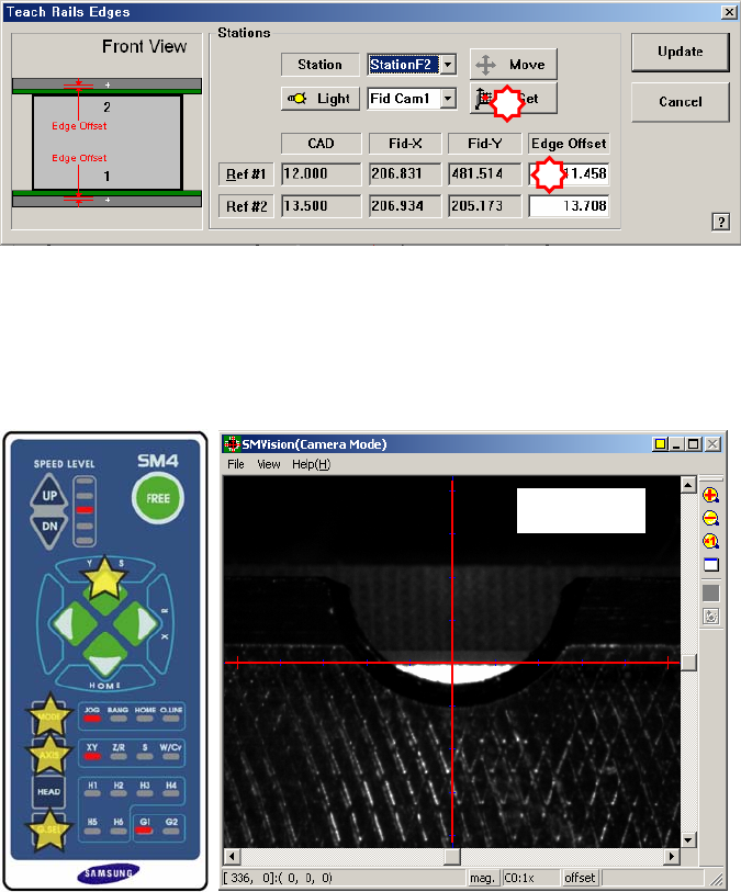 7. Then the downward camera (fiducial cam era) moves to the corresponding position of the fiducial mark. Select XY by pressing the ‘AXIS’ button using the teach box to make the backup table ri se and make the edge of the…