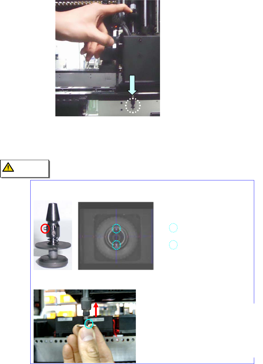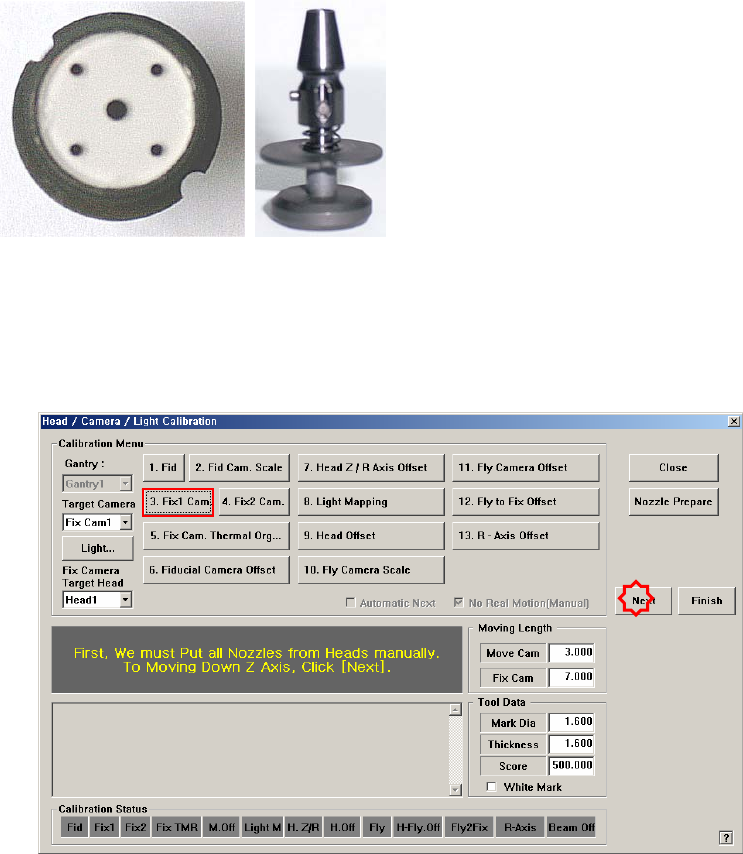 3. “Then the message “ Next Attach the Calibration T ool to Head 1. Click [Next] for Moving Down Head. After Moving, Attach the T ool to head Manually ” appears. Click the <Next> button after inserting the CNT20 no…