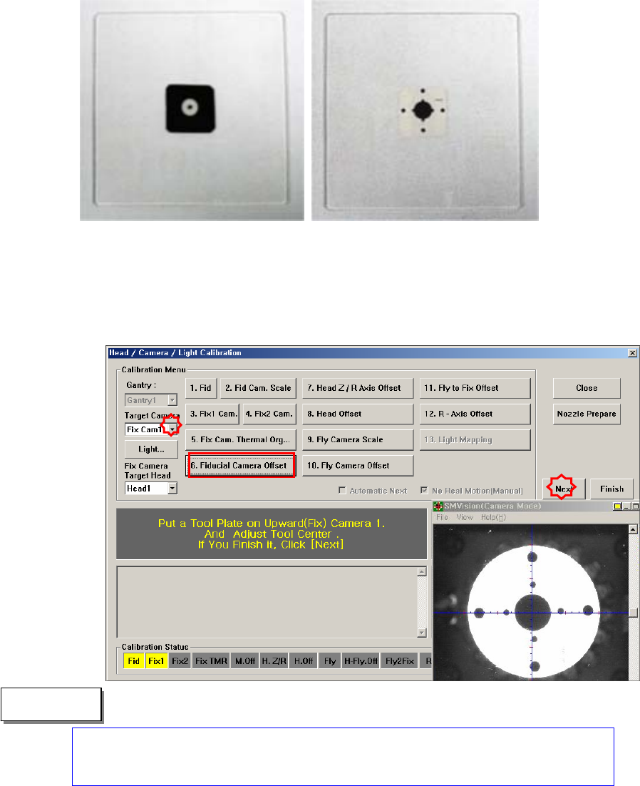 The following is the procedure to calib rate the Fid Cam Offset of the head; 1. If the <6. Fiducial Came ra Offset> button is clicked, the me ssage “First, W e must Put all Nozzles From Heads on Manually . T o Move…