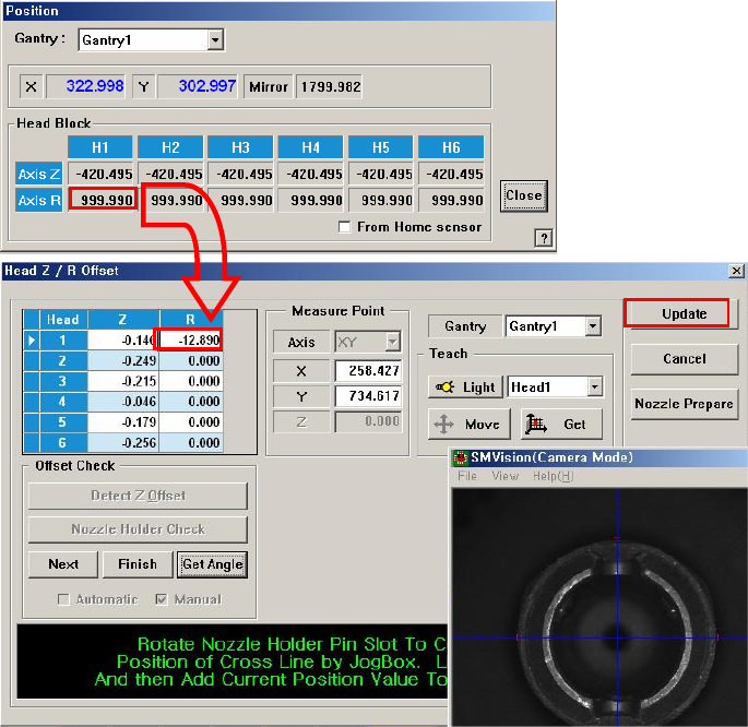 That is, the mechanisms of the #1~# 2 heads and #3~#4 heads, #5~#6 heads must be assembled first in the same direction by using the jig for a nozzle holder . 7. At this time, input the current position value of the R-axi…