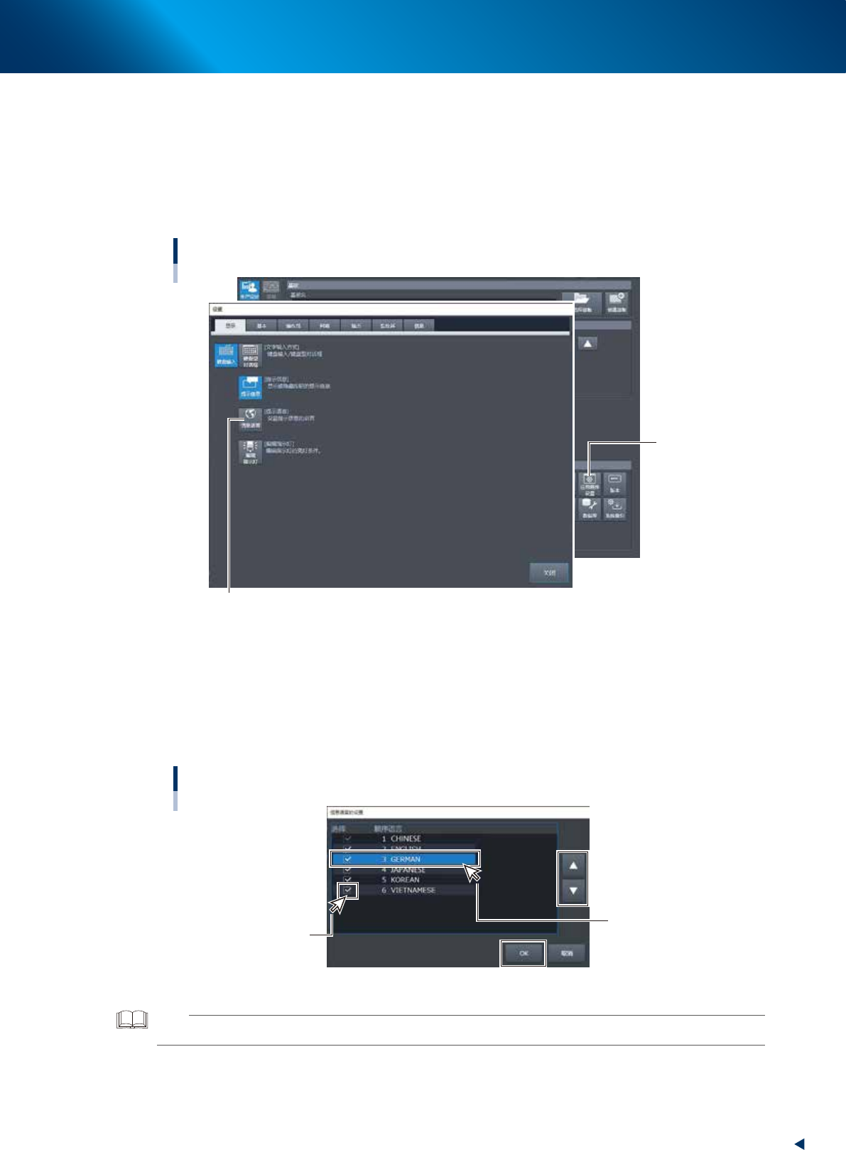 在“信息语言的设置”画面中可以设定“1. 要使用的语言”、“2. 要使用的语言顺序”。