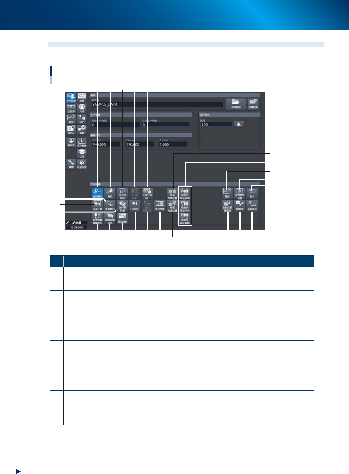 2. 操作画面与各种按钮 2-14 第 2 章 基本操作 2.2 “生产设计”画面 下面,介绍“生产设计”画面中各个按钮的功能。 “生产设计”画面 18 16 19 20 23 22 21 3 4 9 10 11 8 12 7 6 17 15 5 1 2 13 14 26209-KMX-00 按钮名 功能 1 返回原点 使 W 轴以外的所有轴返回原点位置。 2 暖机 进行暖机运行。还可以指定在任意时间进行暖机。 3 作业后停机 使贴装…