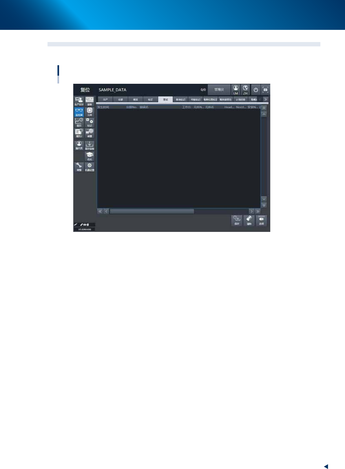 显示过去发生的 100 个错误履历。因识别错误或吸附错误进行了重试等时,在本画面中确认。