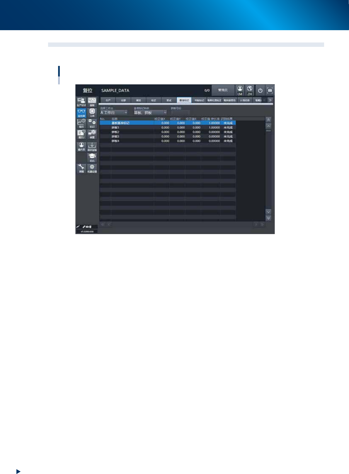 显示“基板、拼板”、“局部”、“点”等基准标记的识别结果与校正结果。