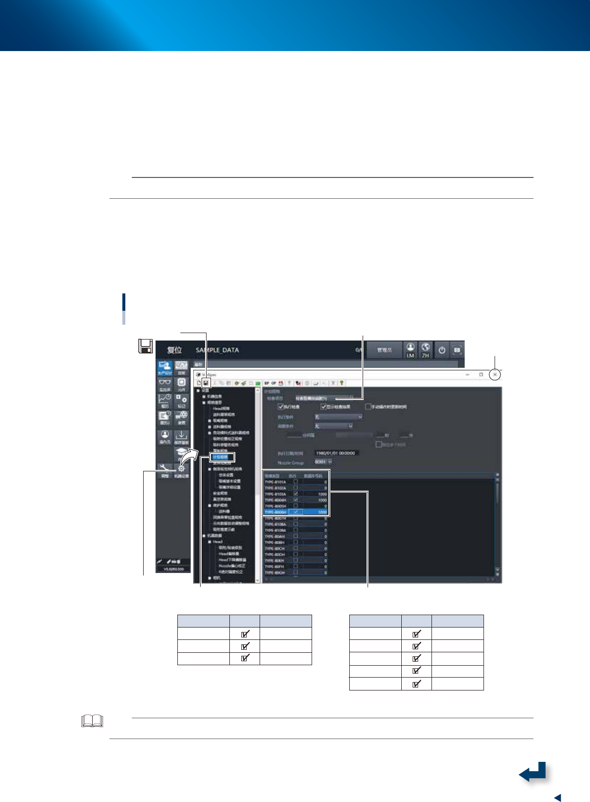 2. 在画面下部列表中勾选对象吸嘴的“执行”选择框,并在“数据库号码”单元格中输入“1000”。