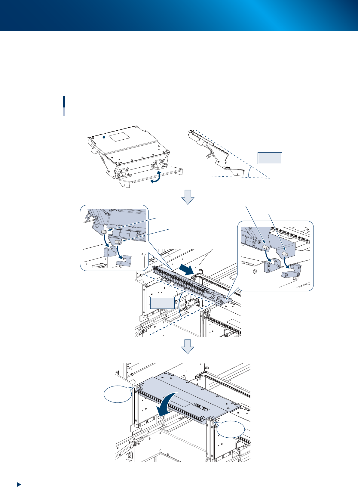 2. 将导槽盖板以约 30 度的角度对准贴片机并插入。此时,导槽盖板左右两侧的前端定位销和后方定位销,