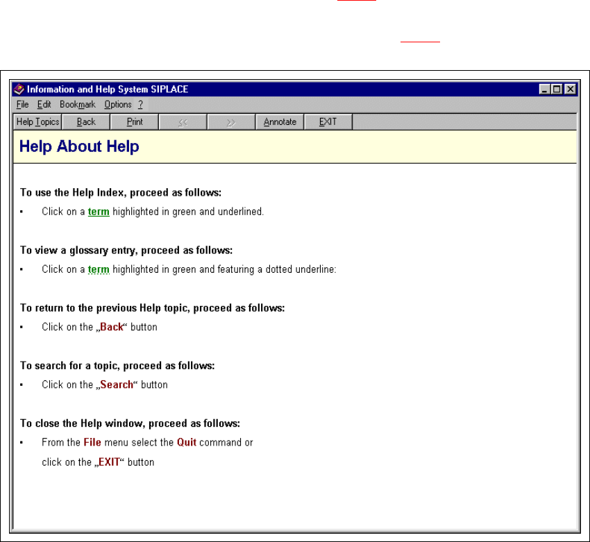 9 Interaktiivne infosüsteem Kasutusjuhend SIPLACE F5/F5 HM 9.1 Üldjuhised Tarkvara versioon SR.407.xx 01/2001 EE väljaanne 256 9.1.1.3 Abiin fo kuvamine jooksva kuva kohta Æ Klõpsak e Help menüüs Help ki rjele v õ i vaju…