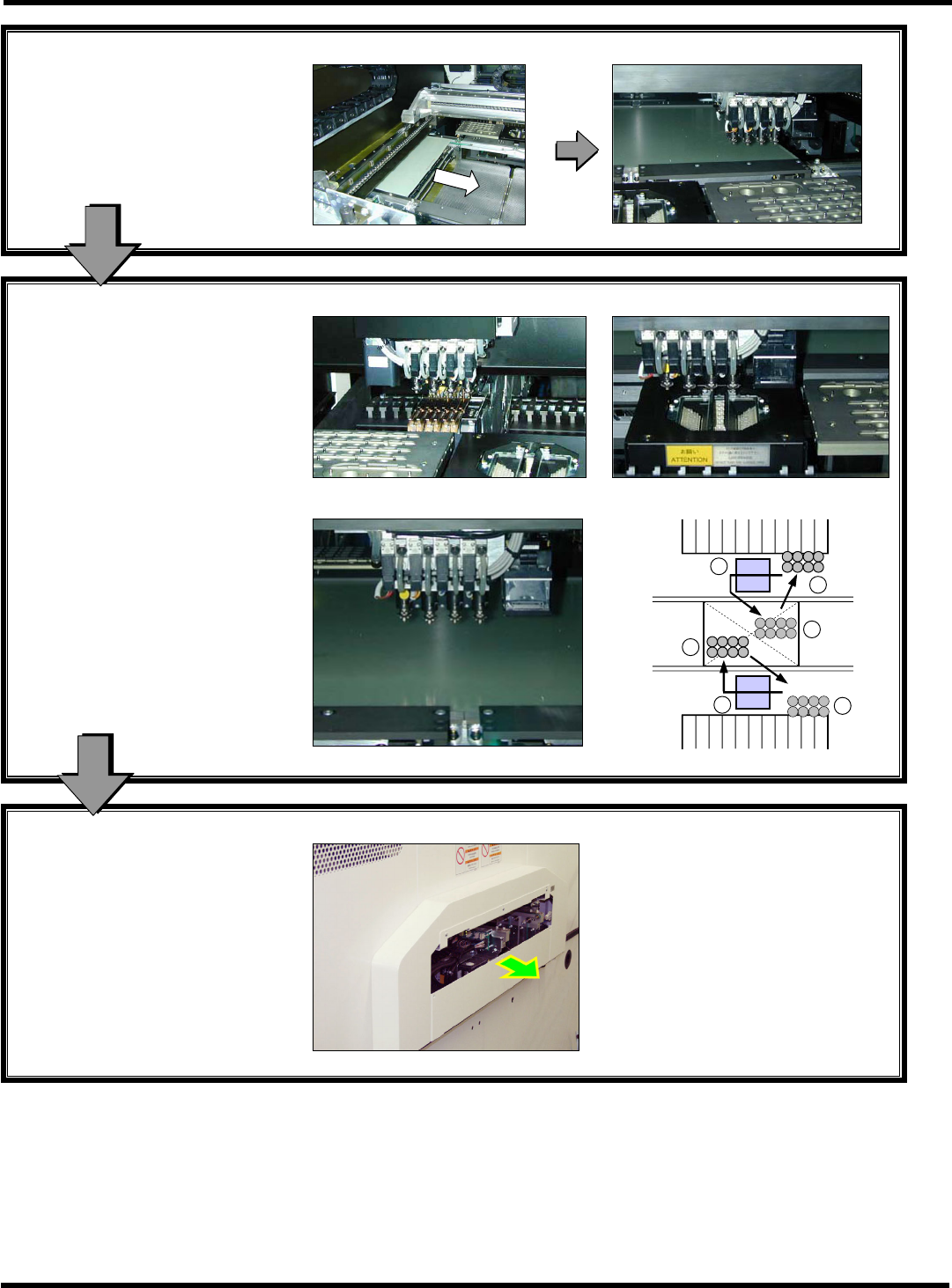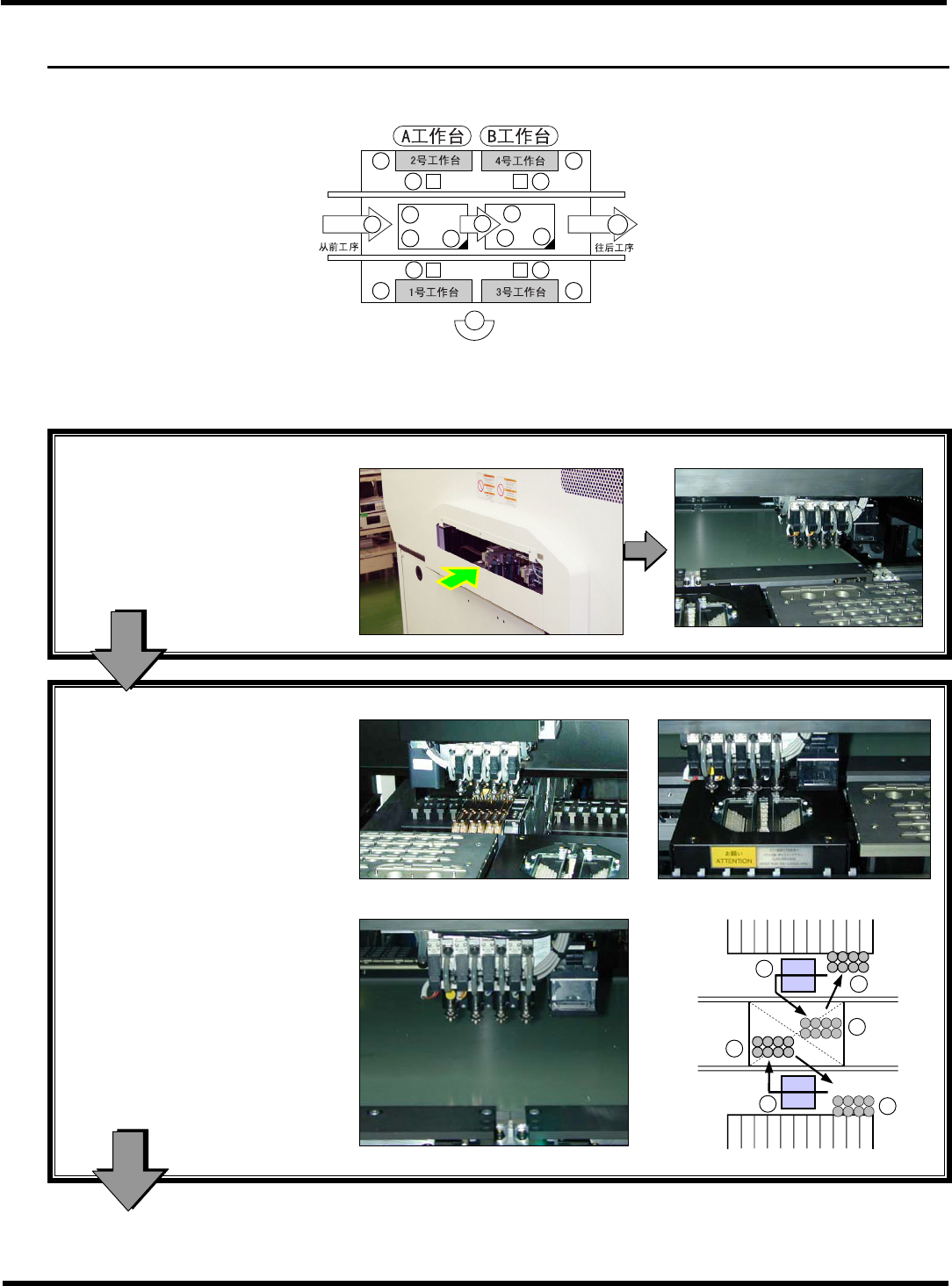 CM602-L 参考手册 1.2 实装的结构 Pa ge 1- 15 1.2 实装的结构 机器动作位置 后侧 前侧 ∗ 照片为通用吸头 (8 吸嘴 ) 。 1. 基板搬入 从前工序搬入 固定基板,进行基板 识别 把从前工序搬出的基板 搬入,并固定 到 A 工作台的基板支座 上。 EJM4A -024P 4Z4C-029P 2. 部品实装 吸着部品 识别部品 通过 2 台移载吸头,高速 实装部品。 4Z4C-032P …