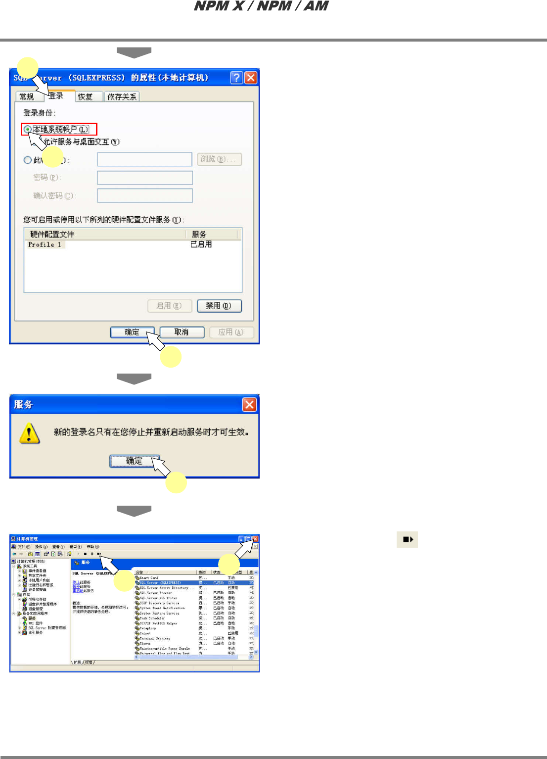 LNB 2.7 品质信息数据库的安装 Page 2-68 EJM5DC-MB-02L-10 5 点击 [ 登入 ] 标签。 6 选择 ‘ 本地系统 帐户 ’ 。 7 点击 [ 确定 ] 。 8 点击 [ 确定 ] 。 9 点击重新启动键 。 10 关闭 < 电脑的管理 > 画面。 2-5056 8 2-5057 9 10 2-5055 5 7 6