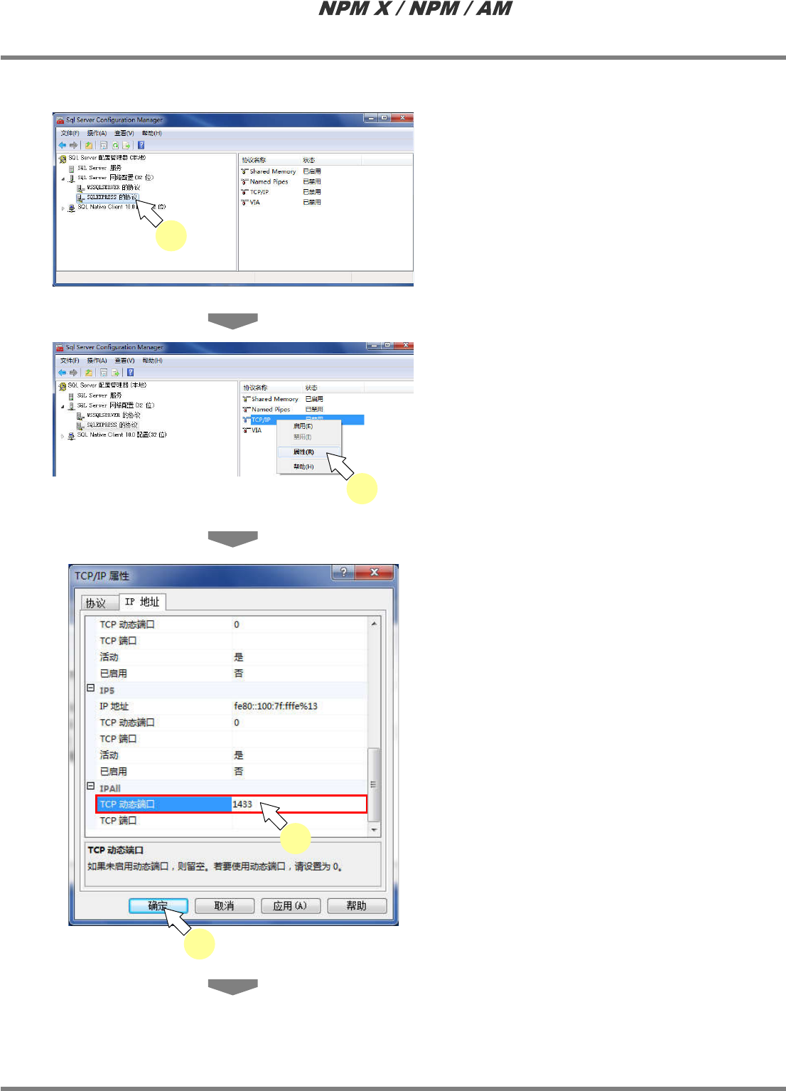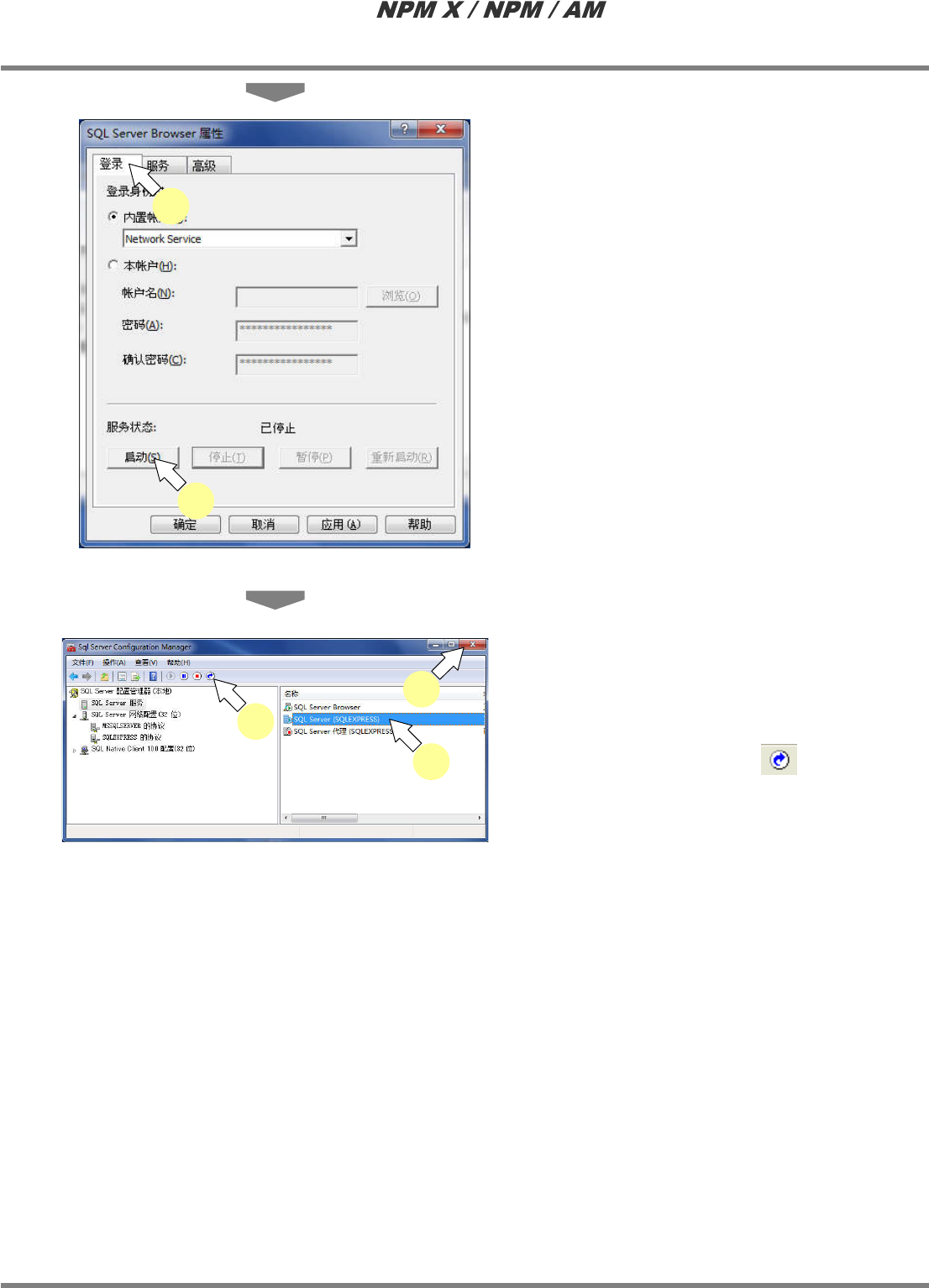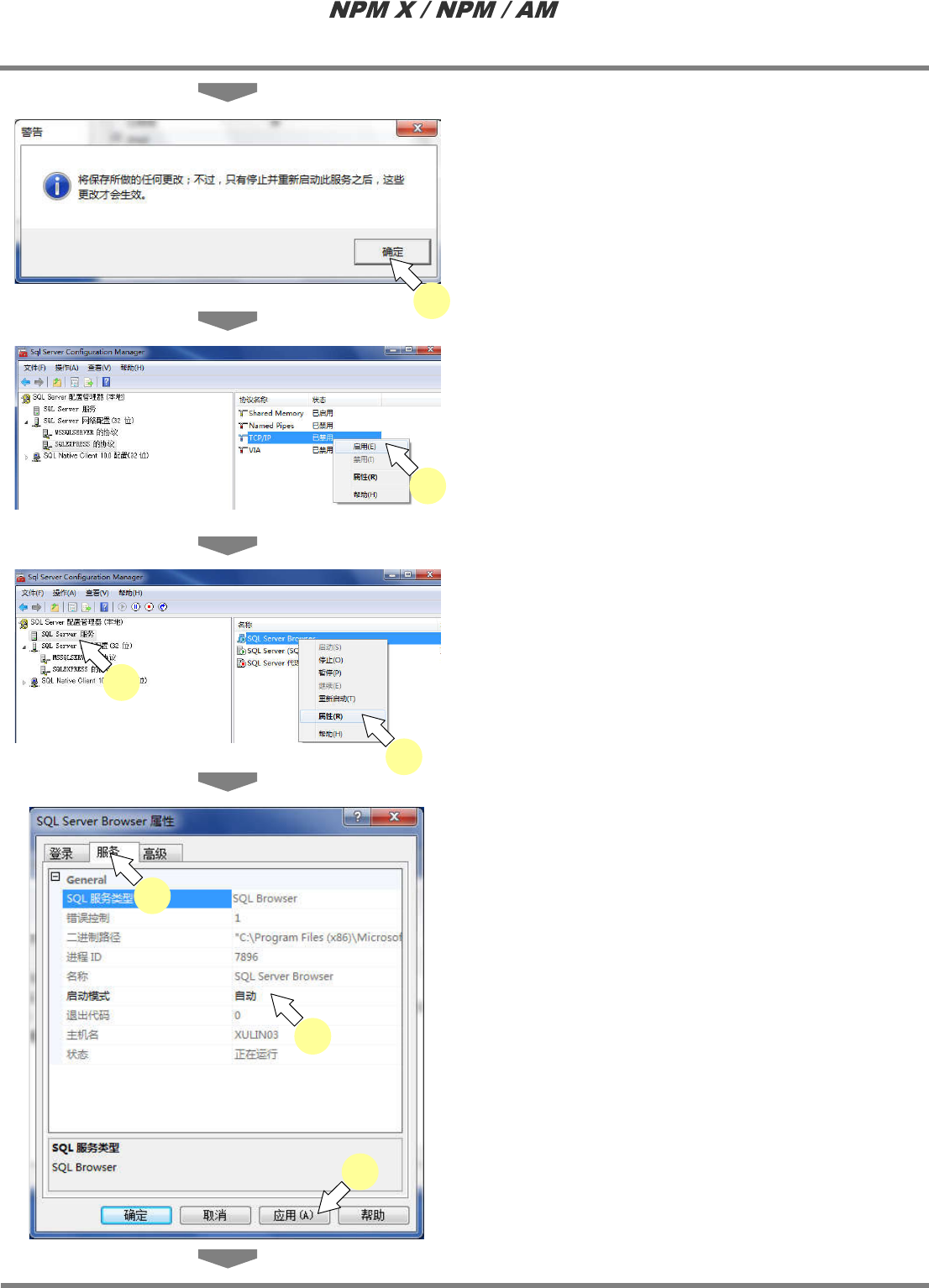 LNB 2.7 品质信息数据库的安装 Page 2-78 EJM5DC-MB-02L-10 4 点击 [ 确定 ] 。 5 在 ‘TCP/IP’ 上右击后,点击 [ 启用 ] 。 · TCP/IP 将转为有效。 6 选择 ‘SQL Server 服务 ’ 。 7 在 ‘SQL Server Brower’ 上右击后, 点击 [ 属性 ] 。 8 点击 [ 服务 ] 标签。 9 在 ‘ 启动模式 ’ 下点击 [ 自动 ] 。 10 点击 …