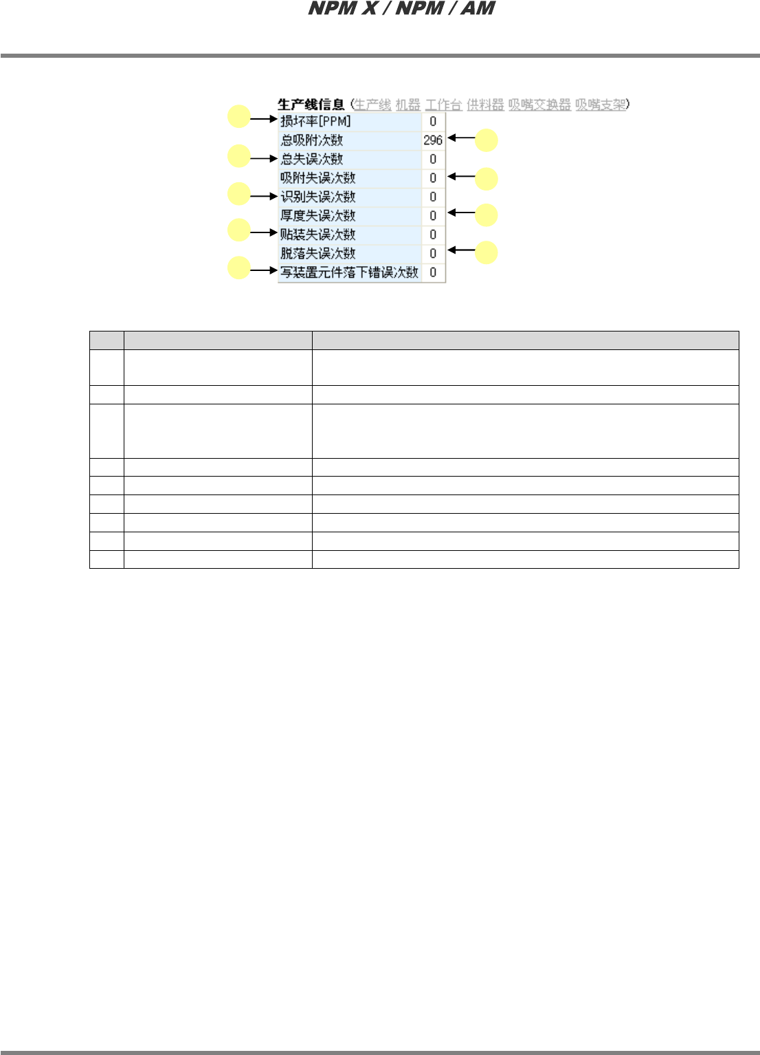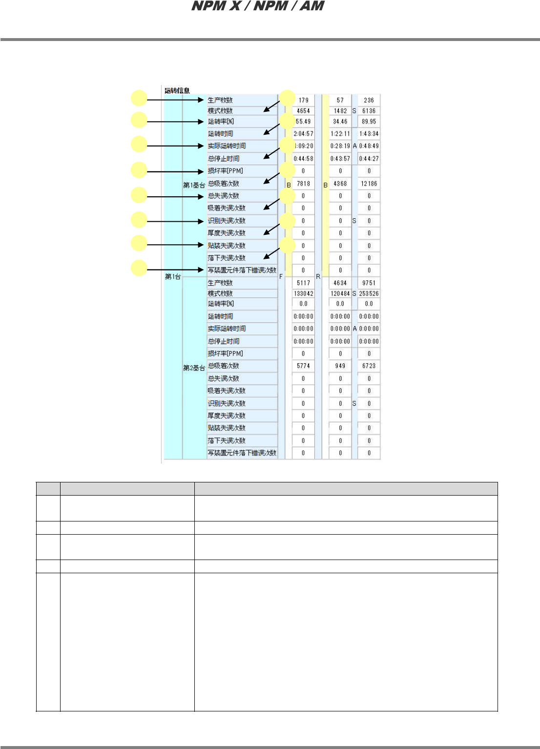 LNB 3.1 生产管理信息 Page 3-10 EJM5DC-MB-03L-09 F) 运转信息 1. 拥有 2 个工作台的机器 ,将显示各工作台的信息。 名称 说明 a 生产枚数 通过生产线的基板枚数。 ( * 1) ( 生产枚数 = 贴装完成的枚数 + 只通过的枚数 ) b 模式枚数 实际生产 ( 贴装 ) 的模式数。 ( * 1) c 运转率 [%] 在生产模式中机器实际进行贴装动作 的 时间比率。 ( * 1) ( 运转率 =…