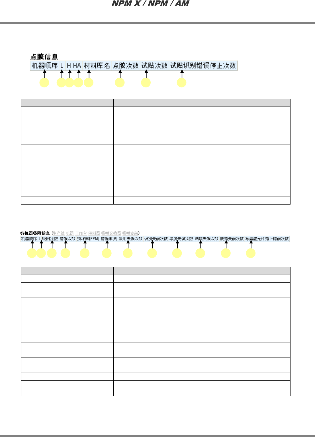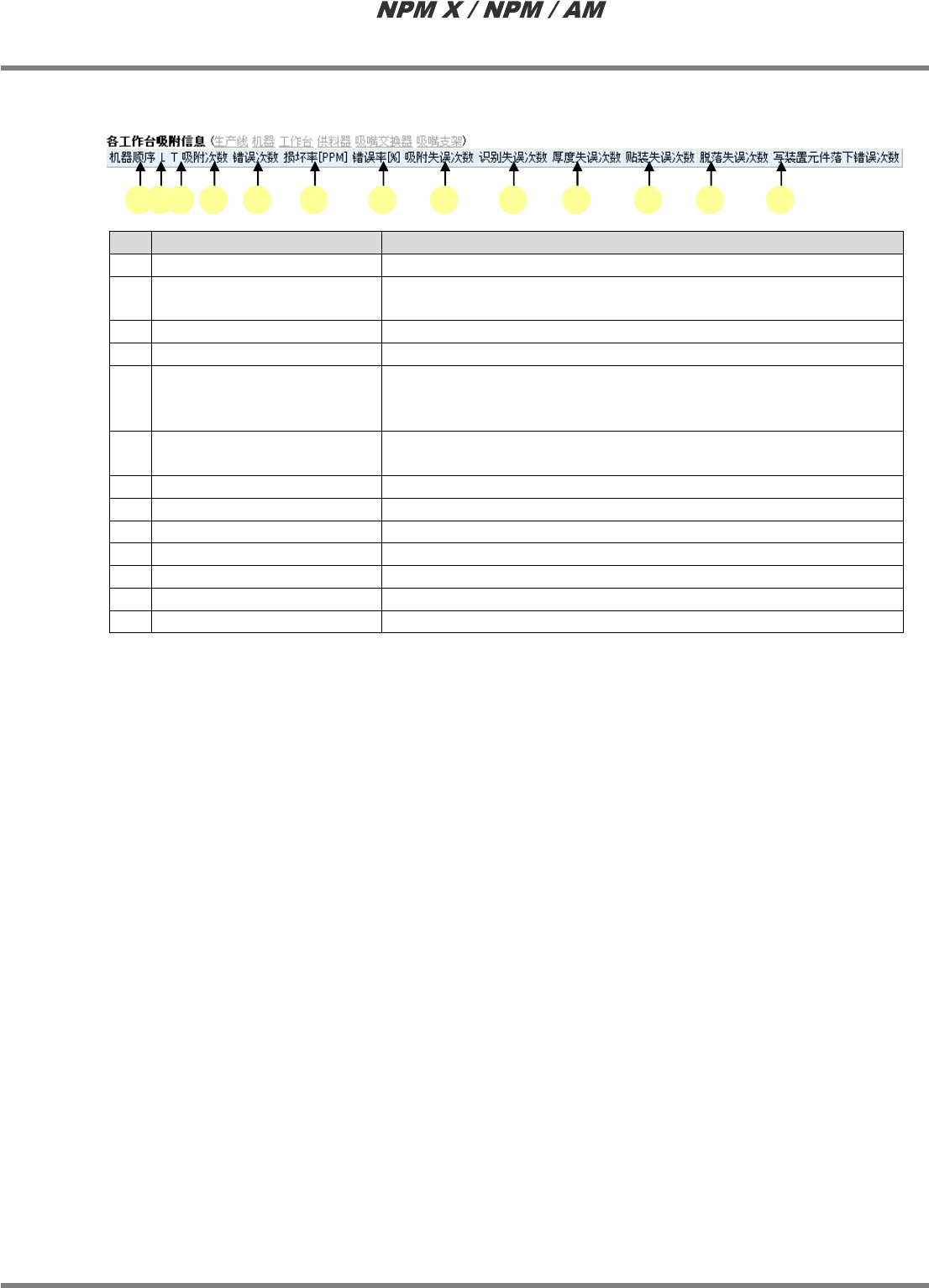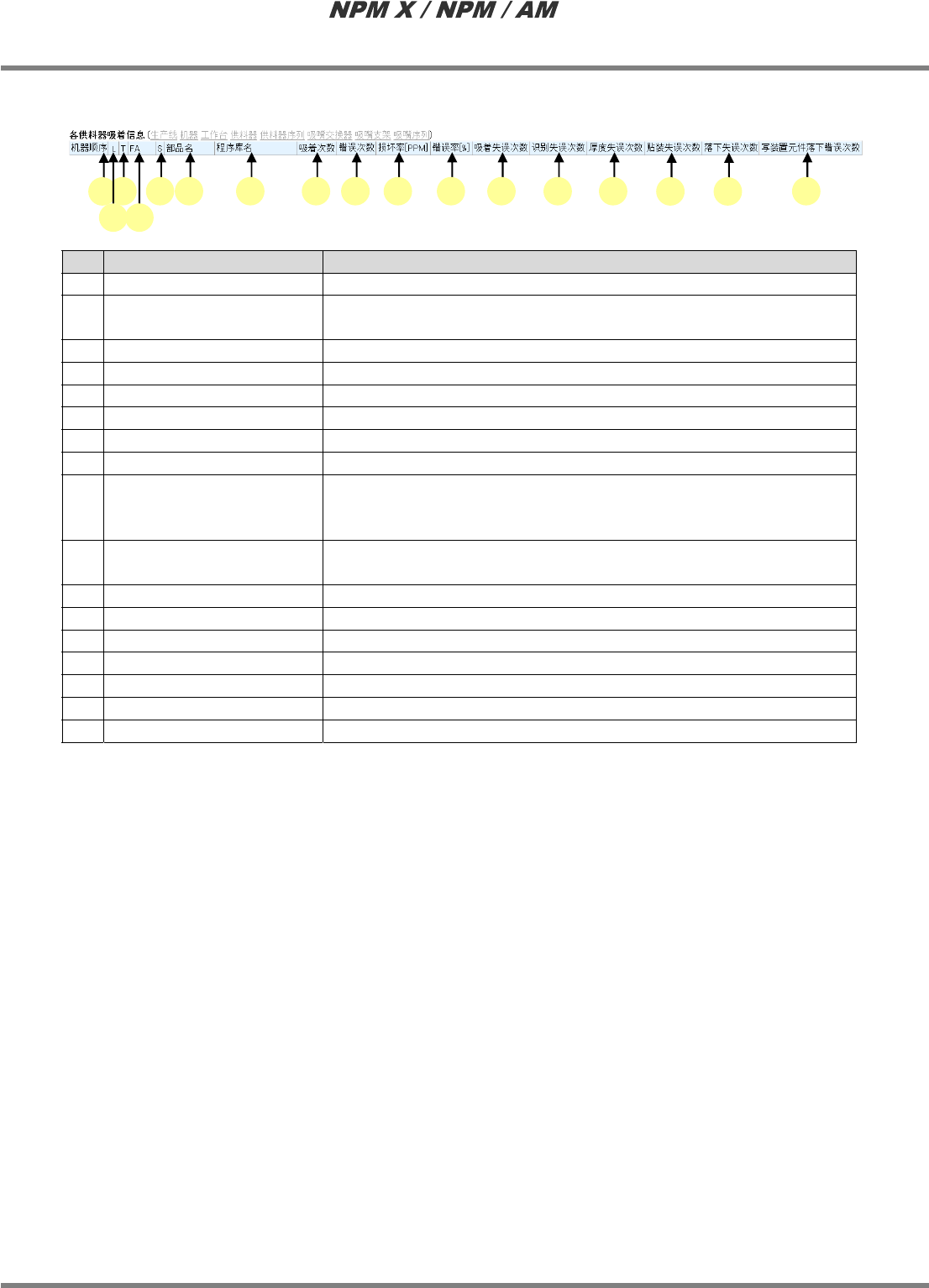 LNB 3.1 生产管理信息 EJM5DC-MB-03L-09 Page 3-15 J) 各个工作台的吸附信息 名称 说明 a 机器顺序 设备的编号。 b L 生产线。 (F: 前 / R: 后 ) * 本项目只在显示转换信 息时显示。 c T 工作台编号。各个设备都是从 1 号开始。 d 吸附次数 此工作台吸附次数。 e 错误次数 此工作台发生错误的次数。 * 错误次数是指吸附失误 、识别失误、厚度失误、贴 装失误、脱落失 误、写装置…