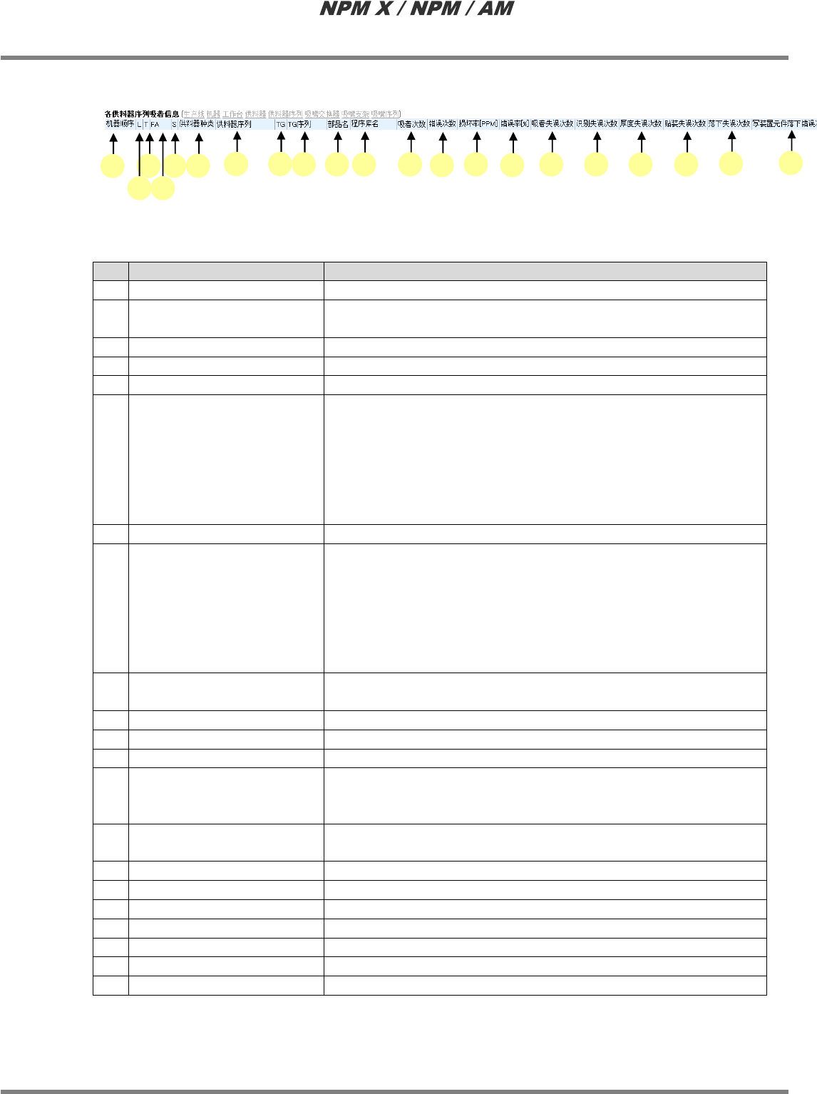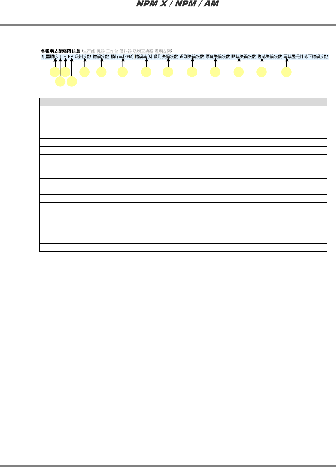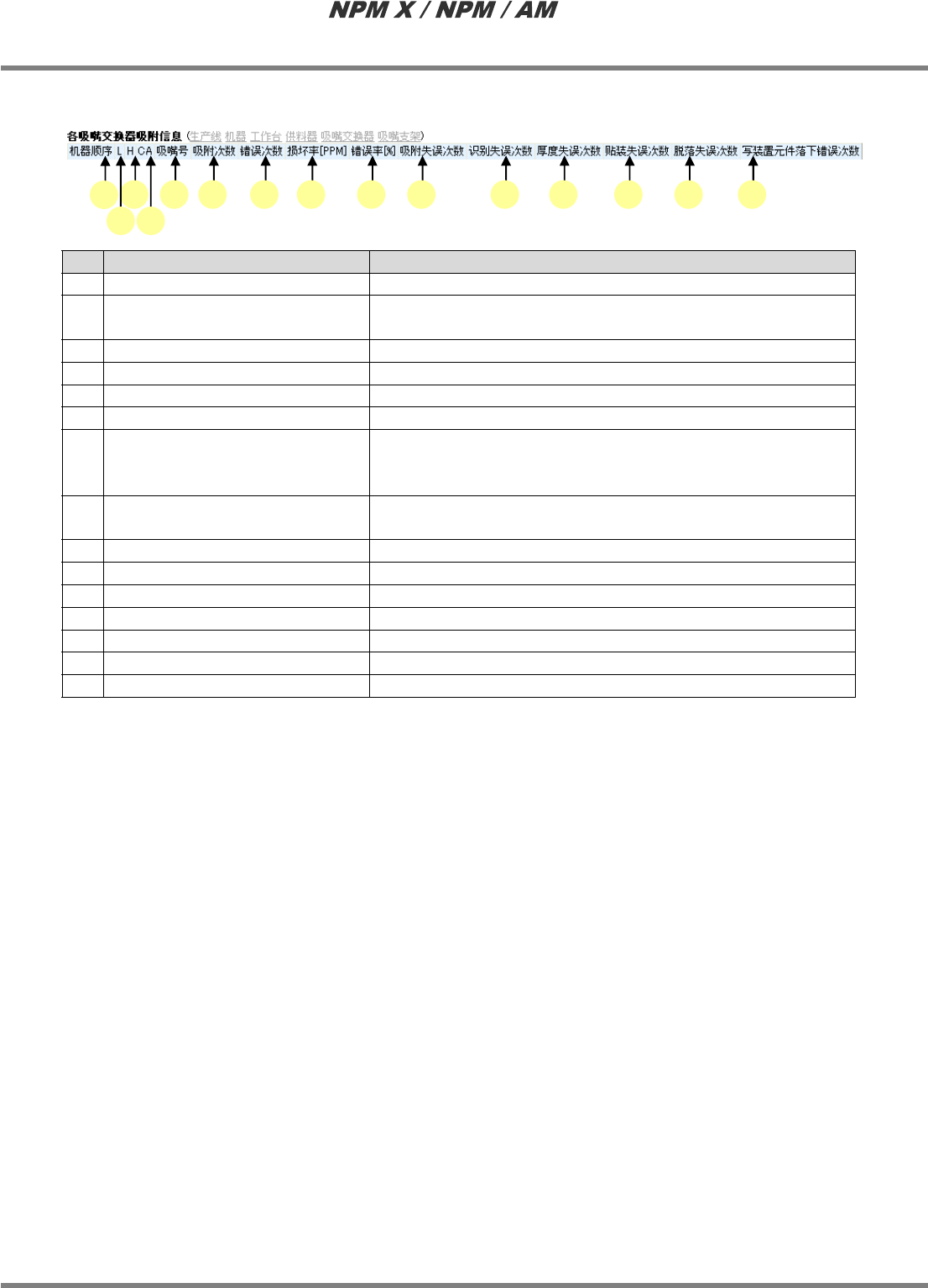 LNB 3.1 生产管理信息 Page 3-18 EJM5DC-MB-03L-09 M) 各吸嘴交换器吸附信息 名称 说明 a 机器顺序 设备的编号。 b L 生产线。 (F: 前 / R: 后 ) * 本项目只在显示转换信息时显示。 c H 贴装头的位置。 (1: 前 / 2: 后 ) d CA 所吸附的吸嘴的配置处 的吸嘴交换器插槽编号。 e 吸嘴号 所吸附的吸嘴的编号。 f 吸附次数 此吸嘴的吸附次数。 g 错误次数 此吸嘴上发生…