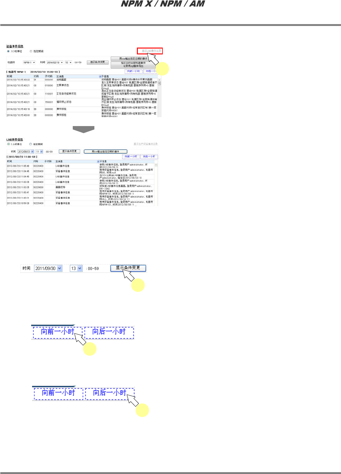 LNB 3.2 事件信息 EJM5DC-MB-03L-09 Page 3-23 ③ 设备事件项目的说明 名称 说明 a 时间 发生事件的日期和时间 。 b 代码 分类事件的主代码。 c 子代码 显示事件详情的代码。 d 主消息 显示事件名称。 e 子信息 显示事件的详细信息。 ④ 事件的导出 可将指定日期的事件以 CSV 形式输出文件,或者将全部机器事件记 录通 过 zip 一次性输出。 1 选择需要输出的 ‘ 机器号 ’ 与 …