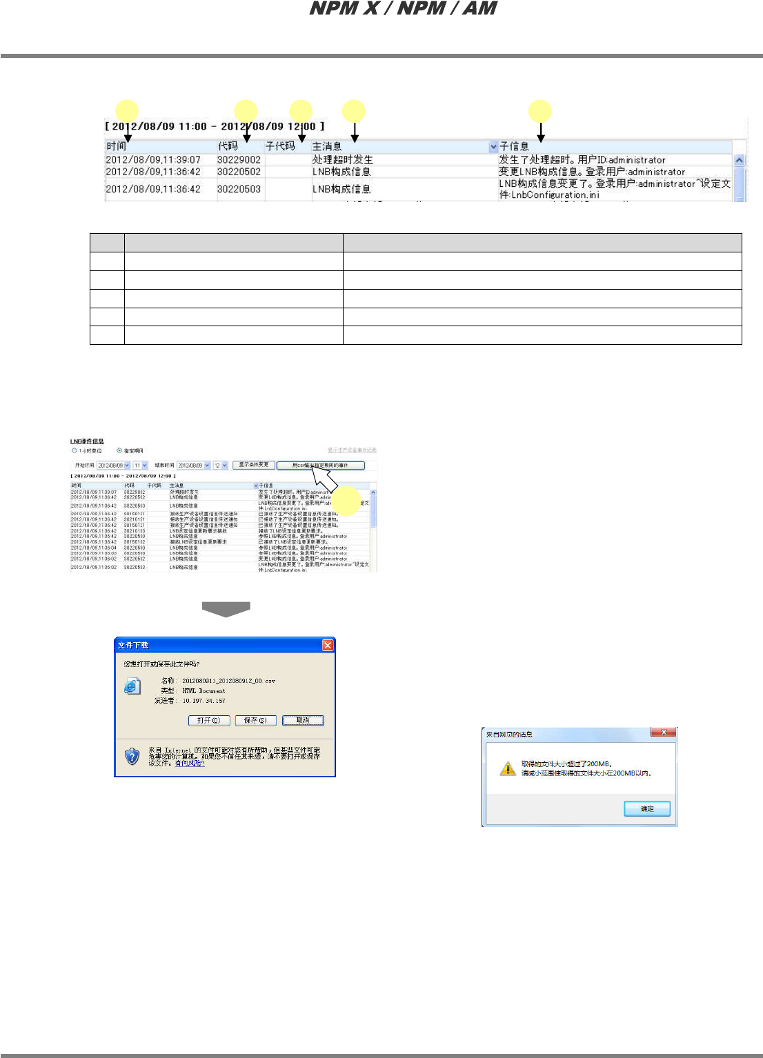 LNB 3.2 事件信息 Page 3-30 EJM5DC-MB-03L-09 B) 选择了指定期间时的操作 1 设定 ‘ 开始时间 ’ 以及 ‘ 结束时间 ’ 后, 点 击 [ 显示条件变更 ] 。 · 将显示指定期间 ( 从开始时间到结束时间为止 ) 的 LNB 事件信息。 * 事件信息的最大显示数 量为 65000 件。当超出 65000 件时,将显示距离结 束日期近的最新 LNB 事件信息。 ① 显示事件 信息的变更 1 选…