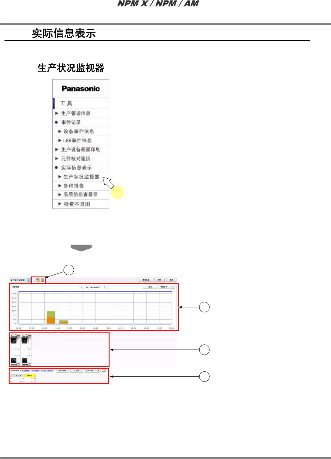 LNB 3.5 实际信息表示 Page 3-40 EJM5DC-MB-03L-09 3.5 参阅生产实际信息。 3.5.1 1 在菜单中选择 ‘ 实际信息表示 ’ 的 ‘ 生产状 况监视器 ’ 。 * 将显示生产张数监视器 。 生产张数监视器由以 下 4 个显示部分构成。 1. 图表部 2. 生产线状态监视部 3. 生产信息部 4.Cycle Time 部 关于各部分的显示内容 、操作,请参照本章的 各部分说明。 3-1001 1 3-…