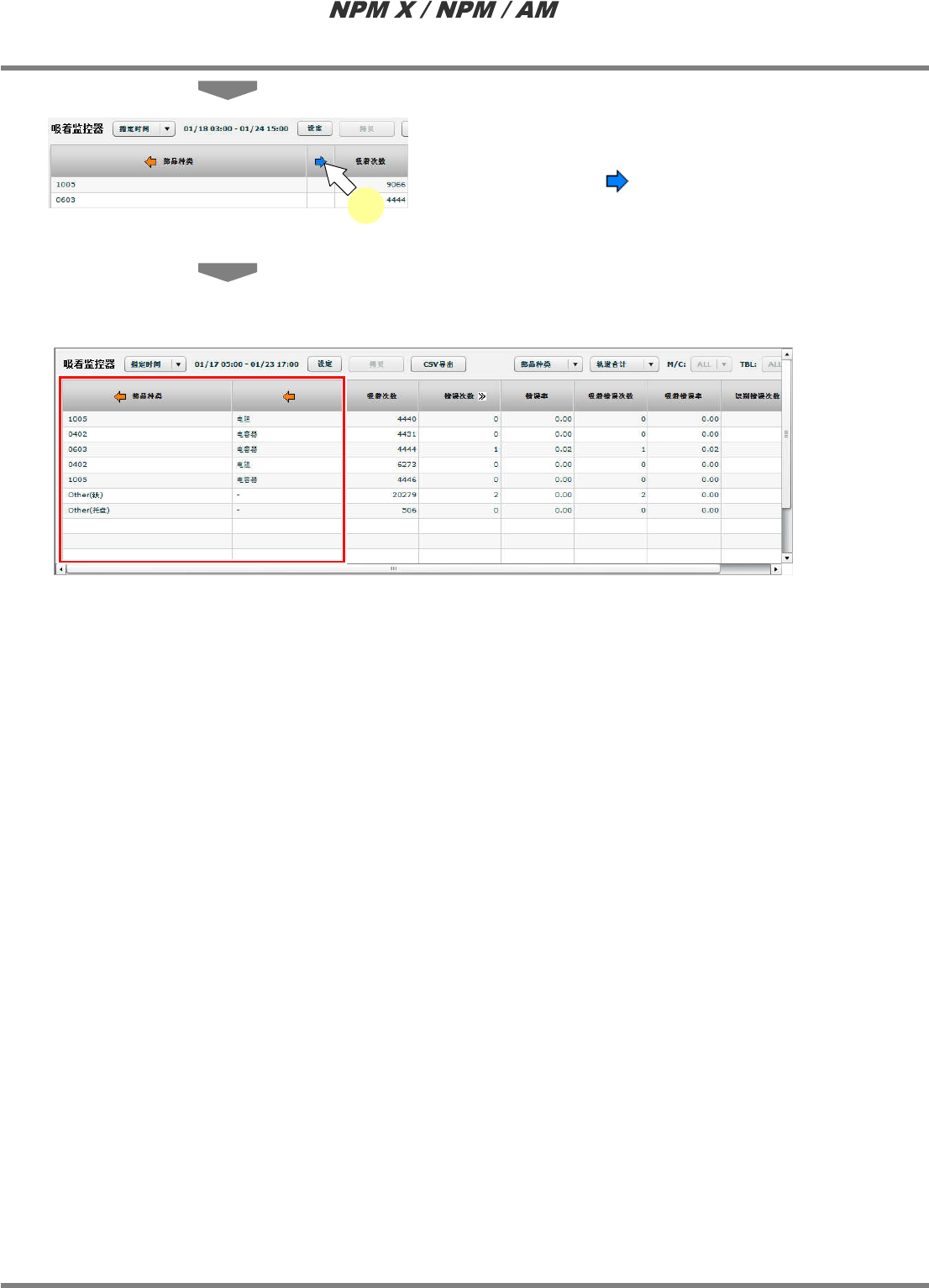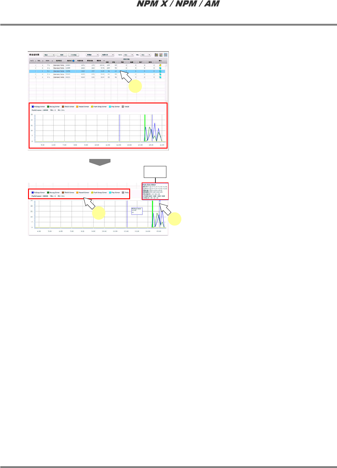 LNB 3.5 实际信息表示 EJM5DC-MB-03L-09 Page 3-55 ③ 错误图表的显示方法 1 点击显示在吸着监控器画面上的元件 纪录。 · 将在画面下方上显示错 误图表。 2 可通过复选框选择各图表的显示 / 非 显示。 · 将光标对准各图表,即 会显示每个时间的错误 数据以及元件变更内容 等的详细数据。 3 将光标对准各图表。 · 将通过提示框显示每个 时间的错误数据以及元 件更换内容等的详细数 据。 3-404…