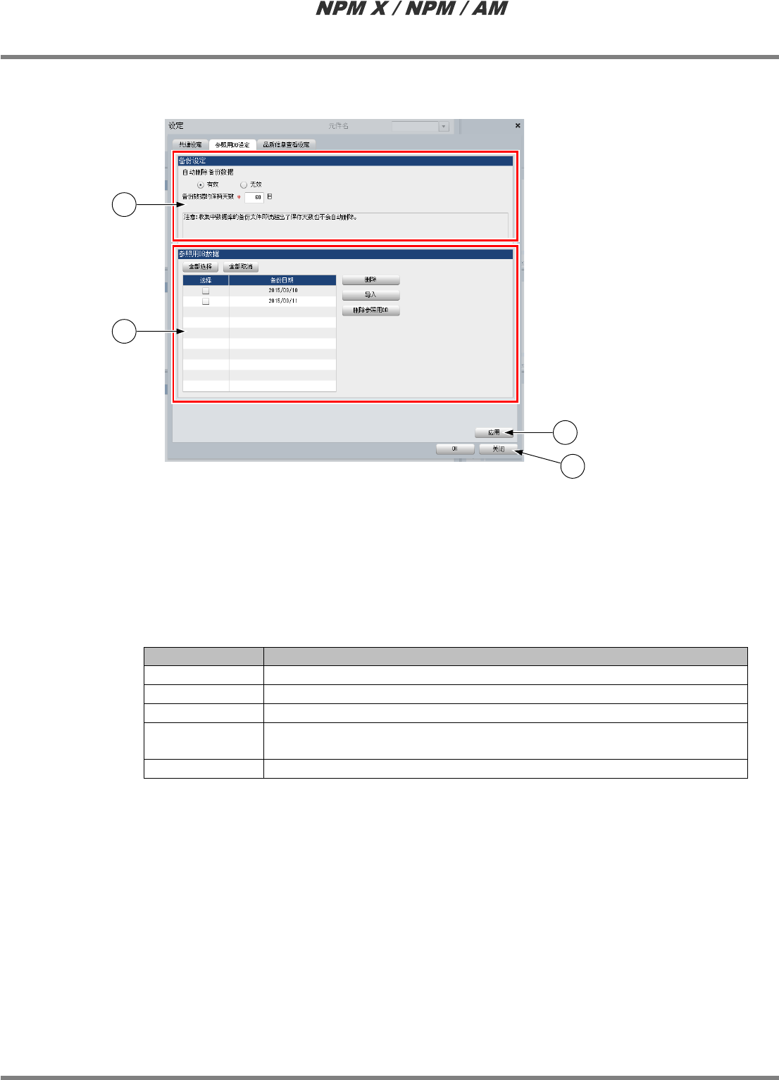 LNB 3.5 实际信息表示 EJM5DC-MB-03L-09 Page 3-87 n 参照用 DB 设定 点击 ‘ 参照用 DB 设定 ’ 标签,将显示 < 参照用 DB 设定 > 画面。 ① ‘ 备份设定 ’ 要将超过保持天数的备份数据自动删 除 时,请选择 ‘ 有效 ’ ,并设定备份数据 的保持天数。 * 自动删除将在每天的 0 点执行。 ② ‘ 参照用 DB 数据 ’ 在一览表中显示备份数据的备份日期 。 *…