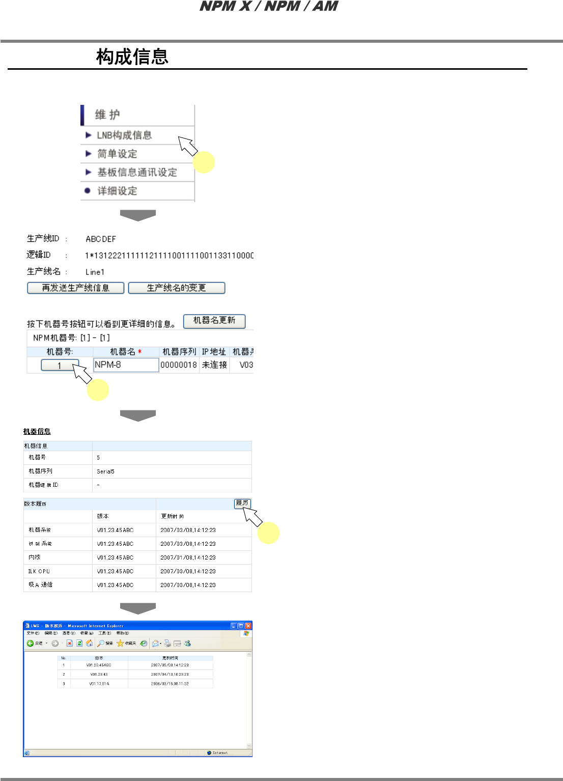 LNB EJM5DC-MB-04L-08 Page 4-1 4. 在本章中, 对 Line Netwo rk Box 的维护功能 ( 生产线构成设备的参阅、 各种设定、 软件的 版本管理等 ) 进行说明。关于 LNB 机器本身的维护说明,请参看维护手册。 如果没有特殊说明,在本章中使用 NPM 系列的画面、插图进行说明。