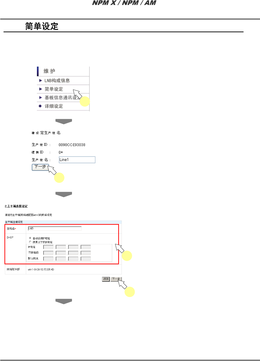 LNB 4.2 简单设定 EJM5DC-MB-04L-08 Page 4-7 · 显示出 < 上一级系统设定 > 画面。 4 输入数据编制系统、 PanaCIM 设定、 TR200 设定、 SPC200 设定、 品质信息 数据库后、 PT200 、点击 [ 下一步 ] 。 * 数据编制系统、 PanaCIM 、 TR200 、 SPC200 、 PT200 是松下生产科技株 式会社的商品名称。 * 为了使用各上一级系统 ,必…