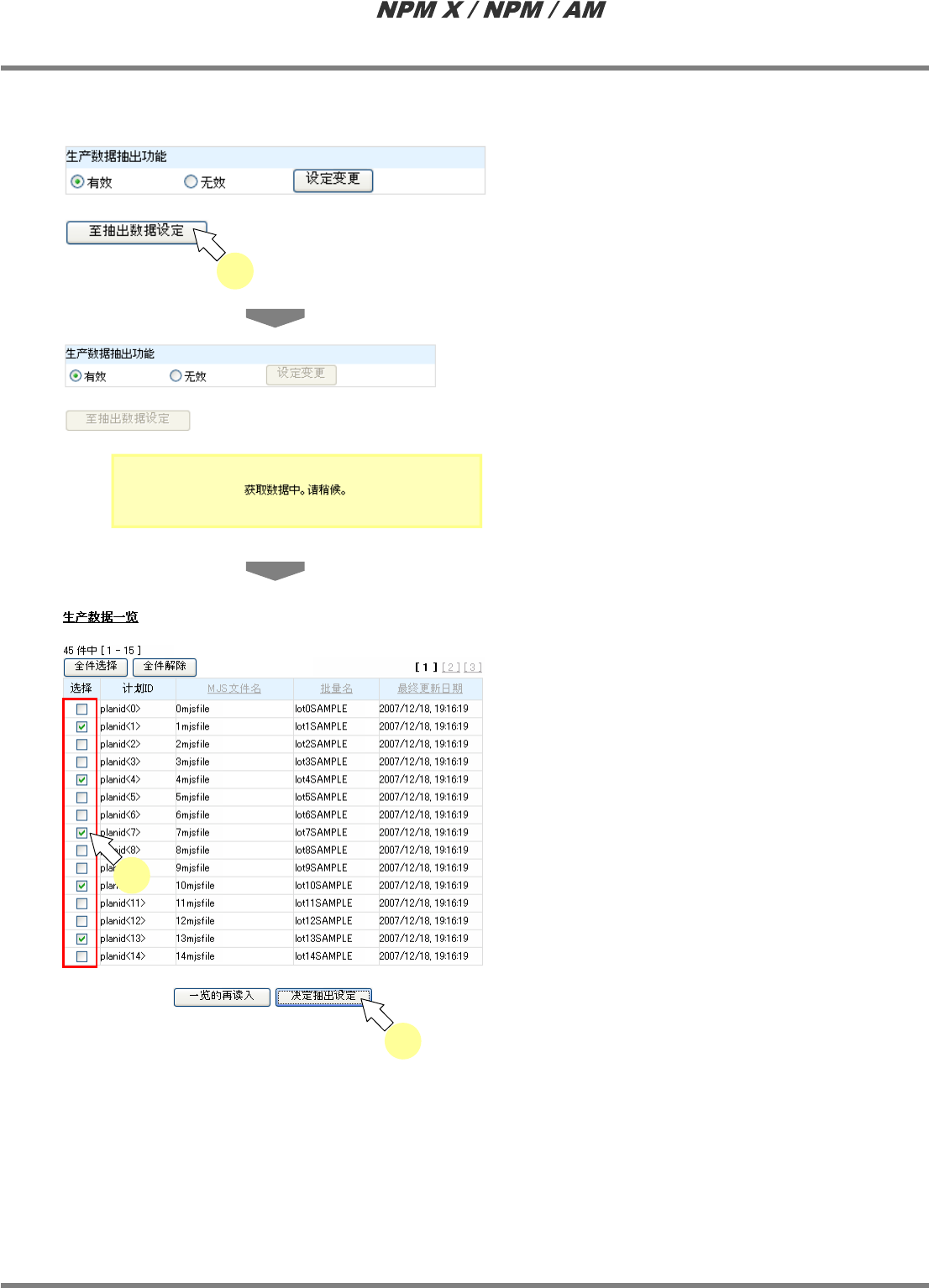 LNB 4.4 详细设定 EJM5DC-MB-04L-08 Page 4-11 n 抽出数据设定 如果将生产数据抽出功能变为有效, 需 设定要抽出的生产数据。 1 点击 < 生产数据抽出设定 > 画面的 [ 至抽 出数据设定 ] 。 · [ 至抽出数据设定 ] 仅在生产数据抽出功 能处于 ‘ 有效 ’ 状态的情况下有效,可点击。 · 显示出 “ 获取数据中。请稍候。 ” 的信息。 · 显示出 < 生产数据一览 >…