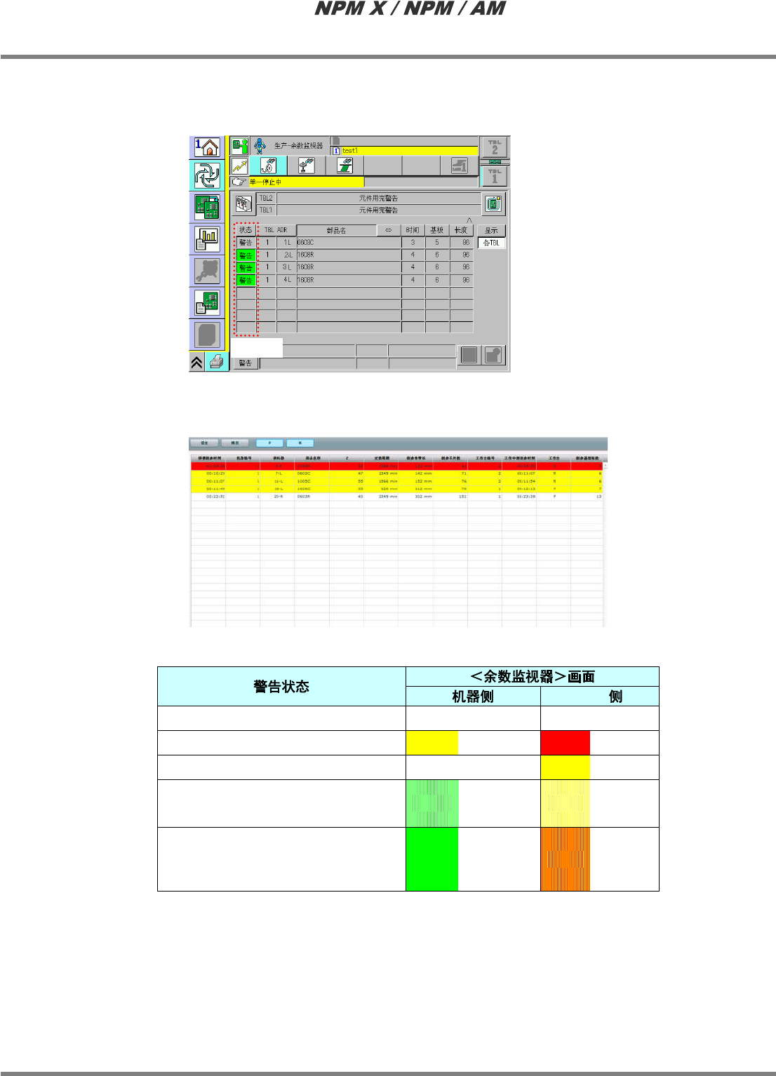 LNB 4.4 详细设定 Page 4-26 EJM5DC-MB-04L-08 C) 有关警告显示 普通警告显示出 “ 余数警告 ” 和 “ 元件用完 ” 。 紧急警告将会在 “ 余数警告 ” 和 “ 元件用完 ” 的基础上预测出元件供给用完情况, 判断负 责人为 1 人时 能否及时完成元件供给,并且以 “ 紧急 1” 和 “ 紧急 2” 进行显示。 有关 “ 余数警告 ” 、 “ 紧急 1” 和 “ 紧急 2” ,将做如下说明。 n …