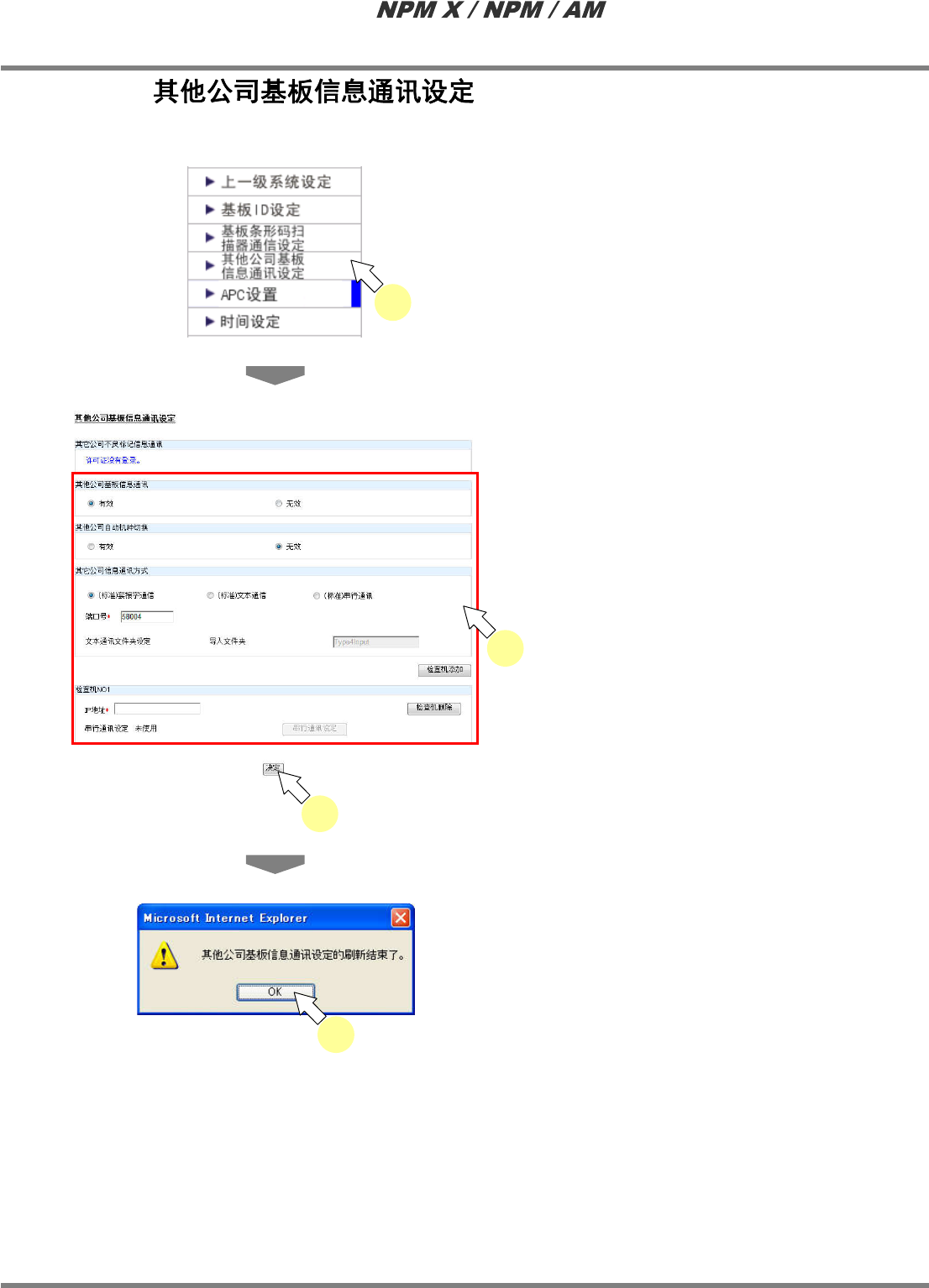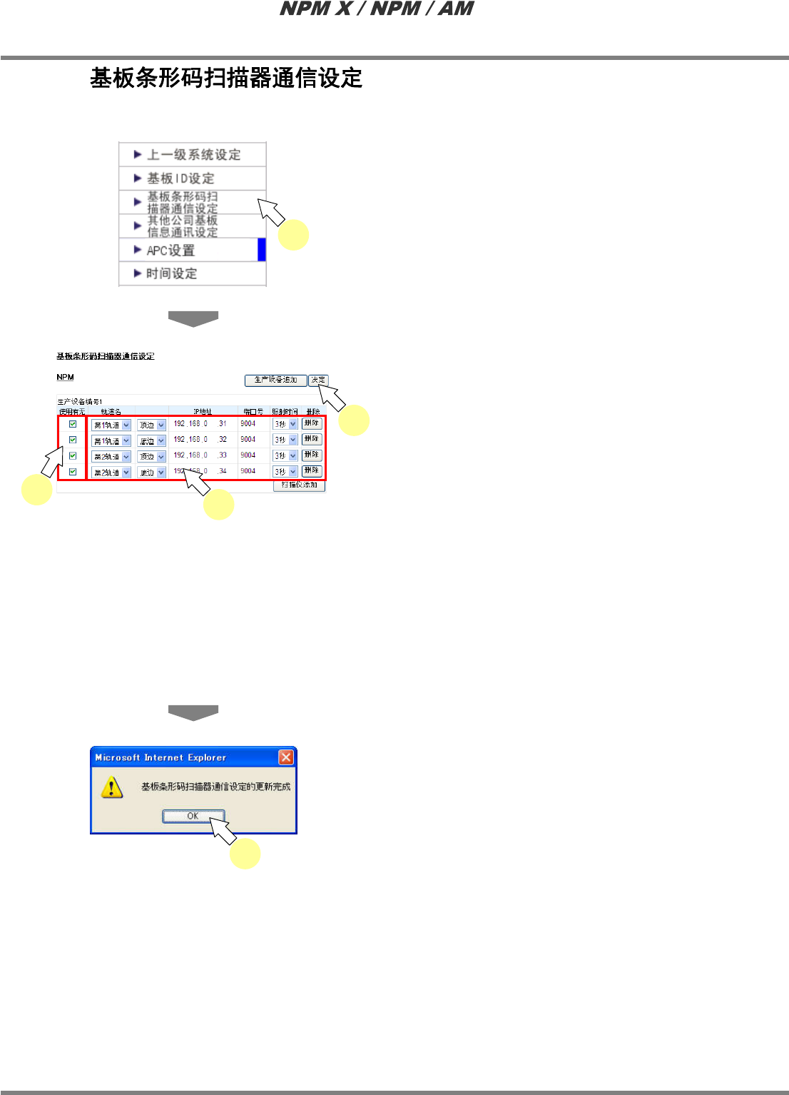 LNB 4.4 详细设定 Page 4-36 EJM5DC-MB-04L-08 4.4.8 在这里,进行基板条形码扫描器的通 信 设定。 1 从菜单中选择 ‘ 详细设定 ’ 的 ‘ 基板条 形码扫描器通信设定 ’ 。 · 将显示 < 基板条形码扫描器通信设定 > 画面。 2 勾选第 1 轨道以及第 2 轨道的正反 ‘ 使 用有无 ’ 。 3 输入在前工序安装了传送带的基板条 形码扫描仪的 ‘IP 地址 ’ 、 ‘ 槽口号 ’…