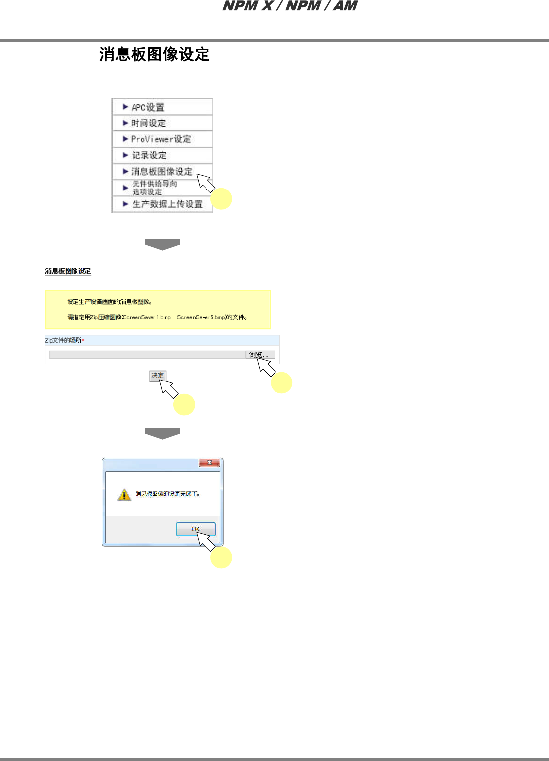 LNB 4.4 详细设定 EJM5DC-MB-04L-08 Page 4-43 4.4.14 在这里,进行消息板图像的设定。 1 从菜单中选择 ‘ 详细设定 ’ 的 ‘ 消息板 图像设定 ’ 。 · 将显示 < 消息板图像设定 > 画面。 2 点击 [ 浏览 ] , 以 zip 形式的文件指定设 定为消息板的图像。 · 将会打开指定文件场所 的对话框,请指定 zip 形式的文件。 3 点击 [ 决定 ] 。 4 点击 [OK…