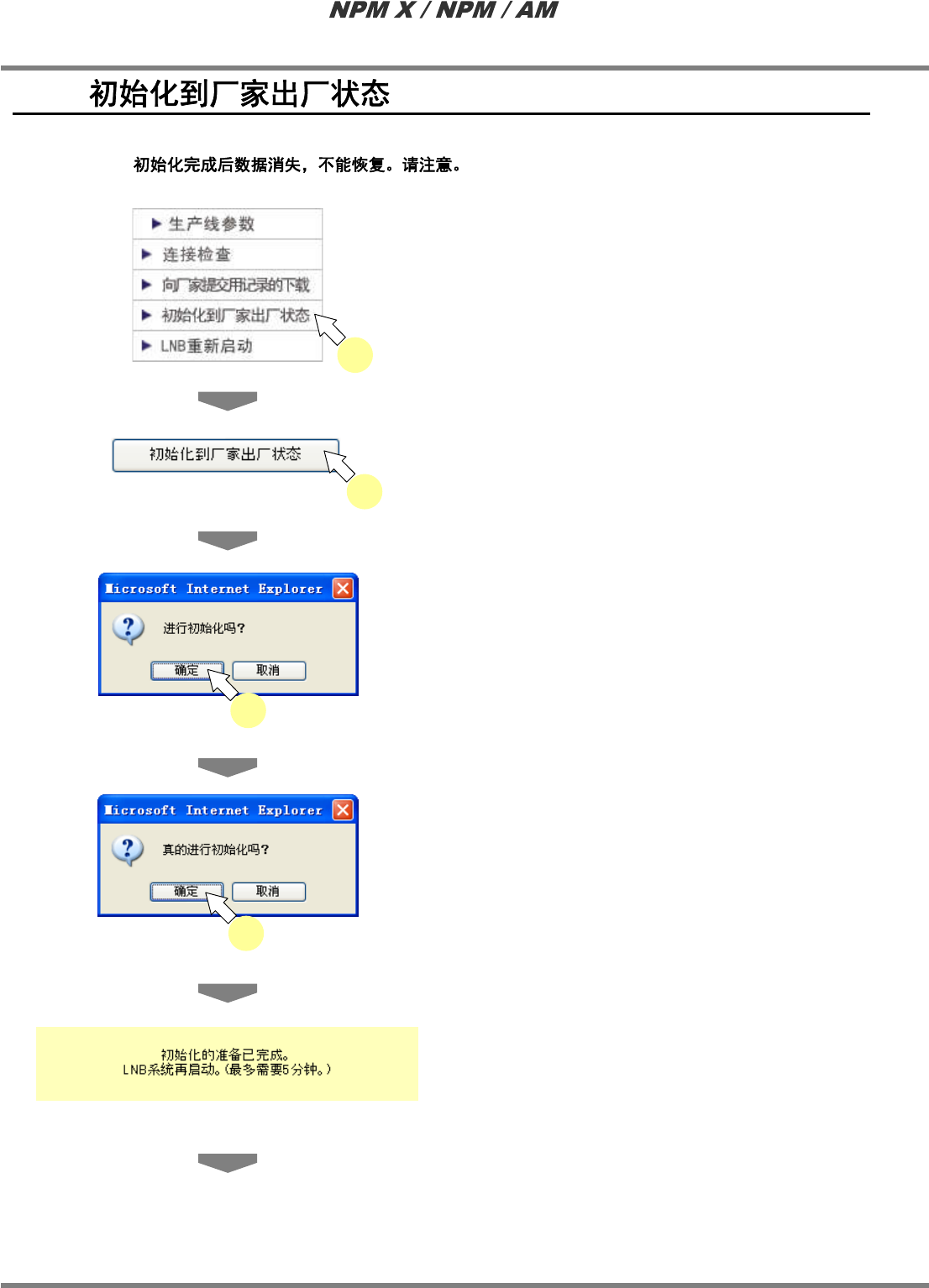 LNB 4.9 初始化到厂家出厂状态 Page 4-58 EJM5DC-MB-04L-08 4.9 可将 LNB 的设定及数据恢复到厂家出厂时的状态 。 1 选择菜单中的 ‘ 初始化到厂家出厂状 态 ’ 。 · 显示出 < 初始化到厂家出厂状态 > 画面。 2 点击 [ 初始化到厂家出厂状态 ] 。 · 显示出确认对话框。 3 点击 [ 确定 ] 。 · 显示出再确认的对话框 。 4 点击 [ 确定 ] 。 · 初始化的准备…