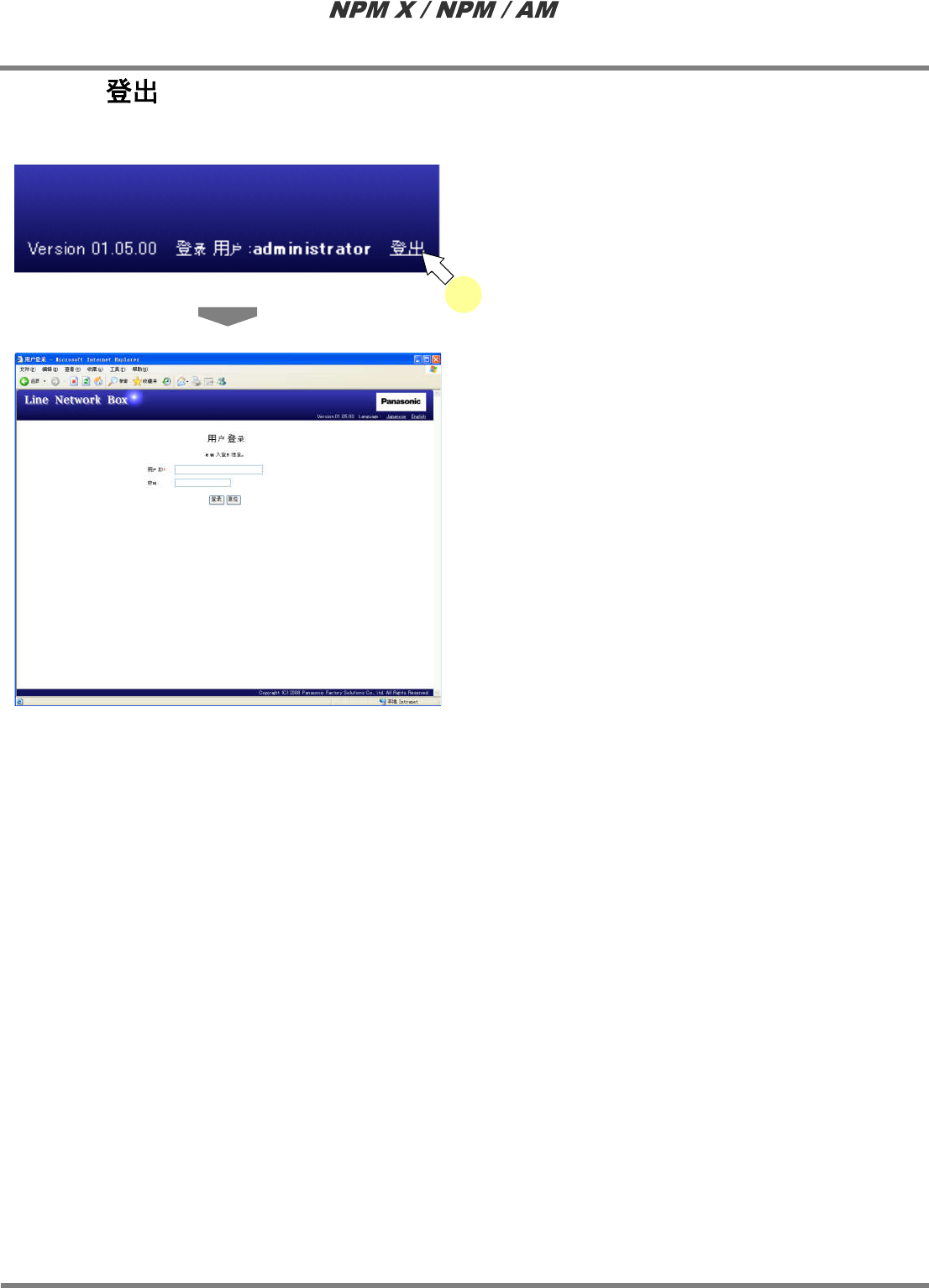 LNB 2.4 品质信息数据库的安装 Page 2-14 EJM5DC-MB-02L-10 2.4.2 为了结束 LNB ,必须进行登出。登 出步骤如下所示。 1 点击画面右上的 [ 登出 ] 。 · 画面回到登录画面。 n 安全须知 LNB 在顾客的终端机上进 行工作。登录作业完毕后可 进行与其权限相应的操作,直到结束。如果 在作业过程中离开操作地点, 有被他人操作的危险。 由 此, 强力推荐在离开之前进行登出或者采取 屏幕锁定等措施…