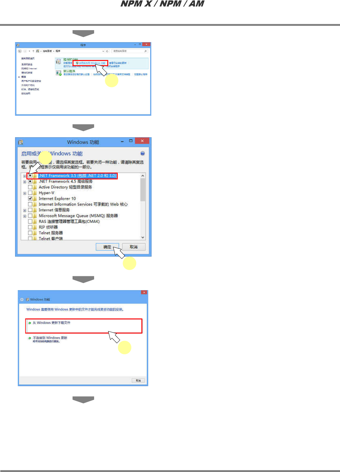 LNB 2.7 品质信息数据库的安装 Page 2-44 EJM5DC-MB-02L-10 4 点击 [ 启动或关闭 Windows 功能 ] 。 5 选择 [.NET Framework 3.5( 包括 .NET 2.0 和 3.0)] ,点击 [ 确定 ] 。 6 点击 [ 从 Windows 更新下载文件 ] 。 2-5104 4 2-5105 5 5 2-5106 6
