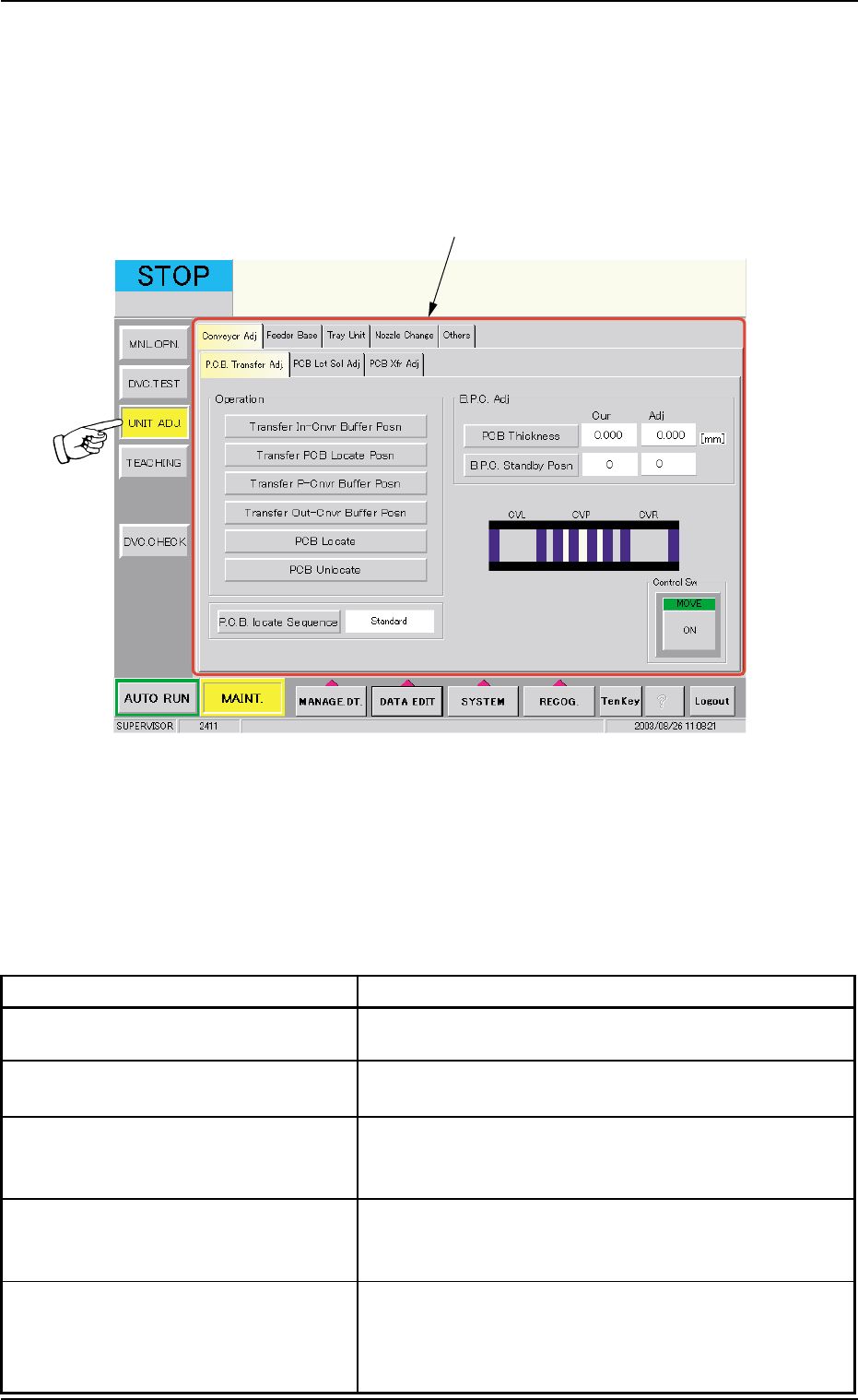 When the "P.C.B. Transfer Adj." tab is pressed in the "Conveyor Adj" tab