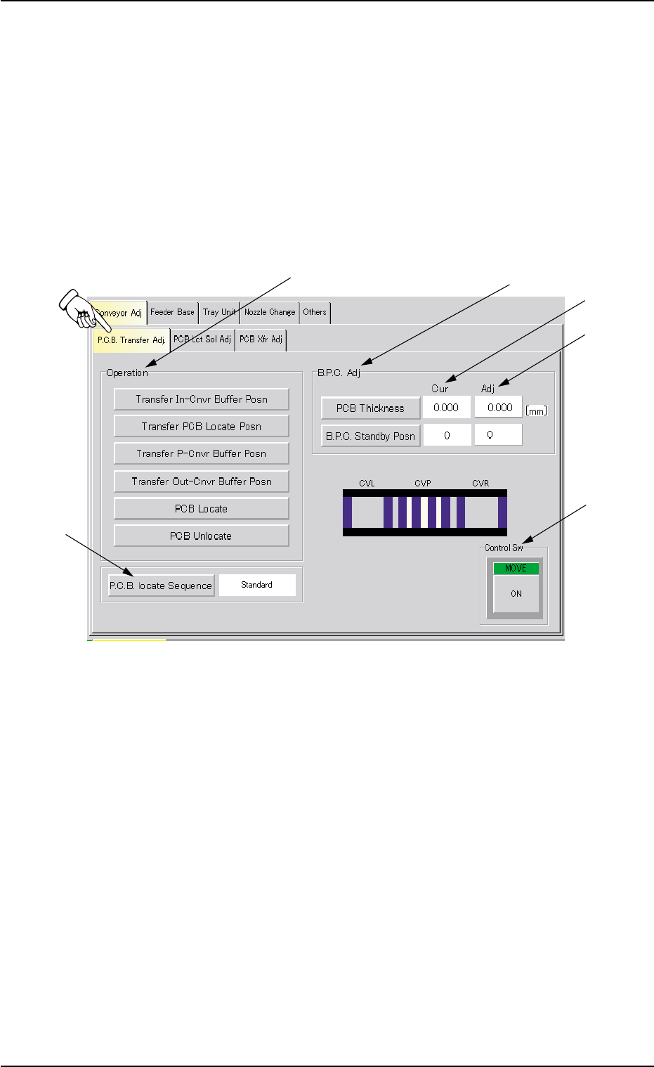 When the "P.C.B. Transfer Adj." tab is pressed in the "Conveyor Adj" tab