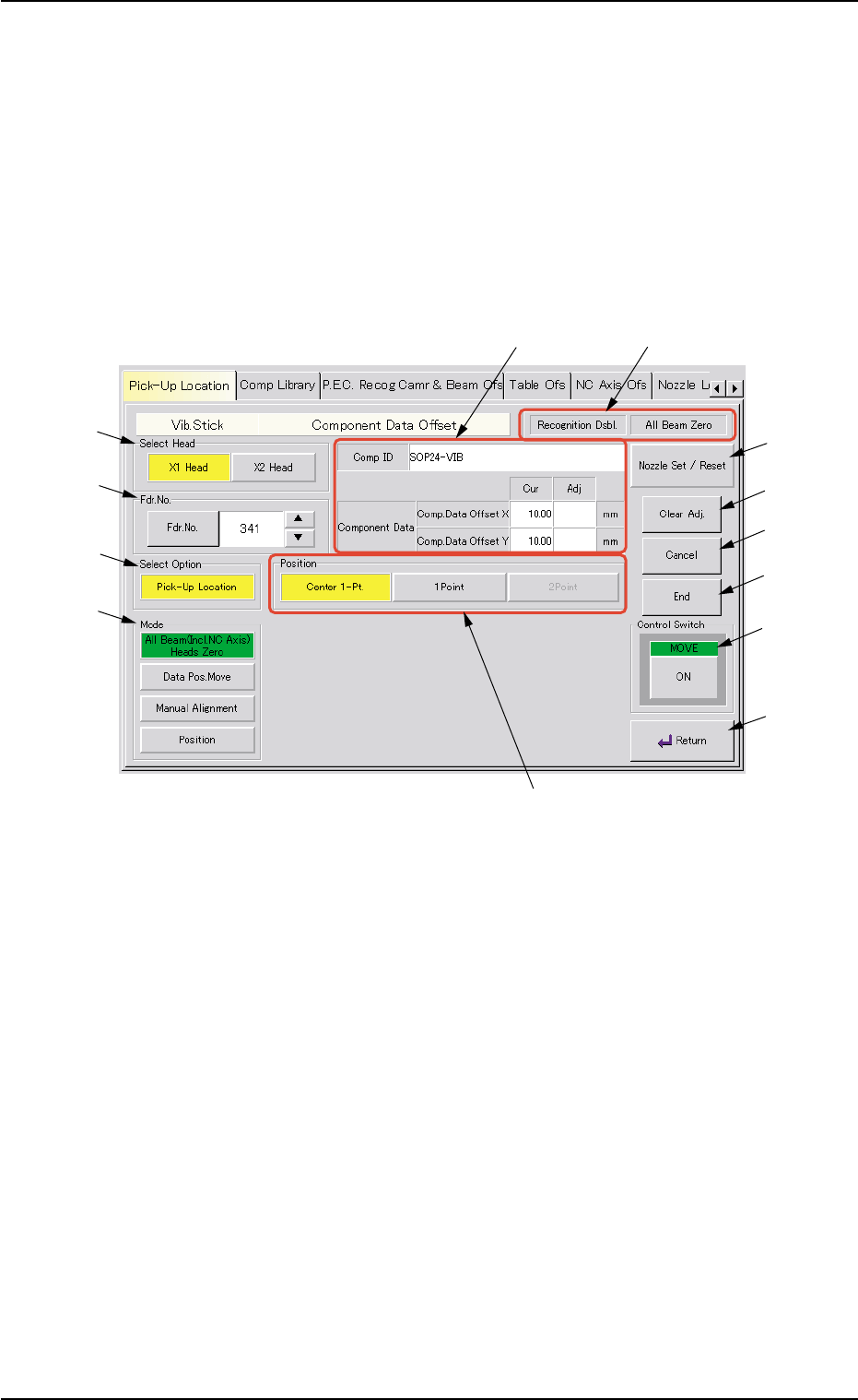 AHB01ESPP 5.1.3 "Vib. Stick Component Data Offset" Sheet The corresponding sheet makes it possible to perform a teaching op- eration to align the center of the vacuum nozzle with the center of the component sup…
