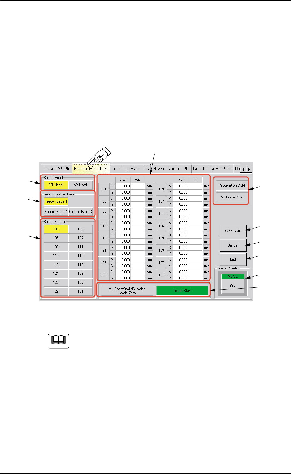 AHB01ESPP 5.17 "Feeder (B) Offset" T ab The corresponding tab enables the operator to perform the teaching operation on the feeder (B) offset data. After the feeders to be used actually are installed on the slo…