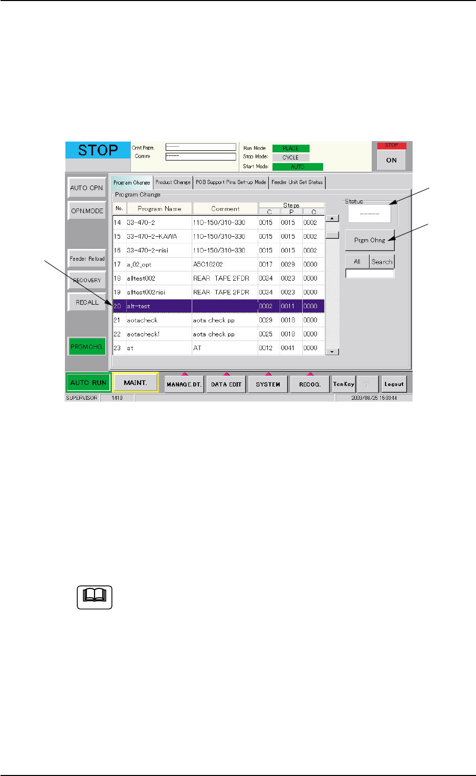 3. Program Change Operation 3 . 1 Selection of Current Pattern Program A pattern program must be selected as a current one in the "Program Change" tab sheet of the "PRGM. CHG." window (submenu). Fig. …