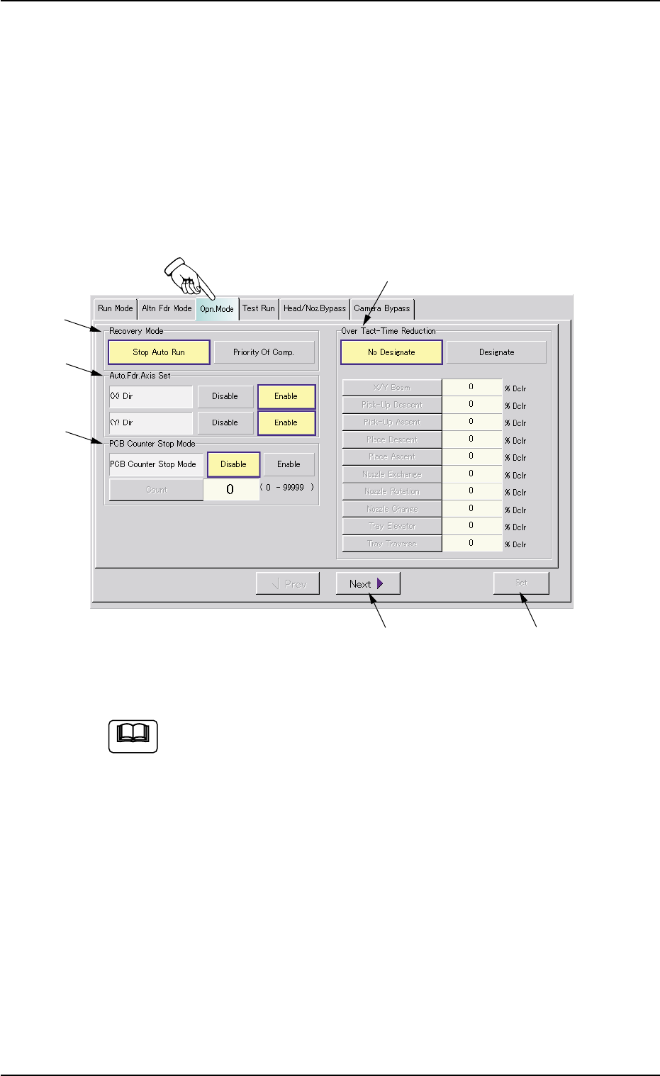operation modes such as "Recovery Mode", "Auto. Fdr. Axis Set", "PCB