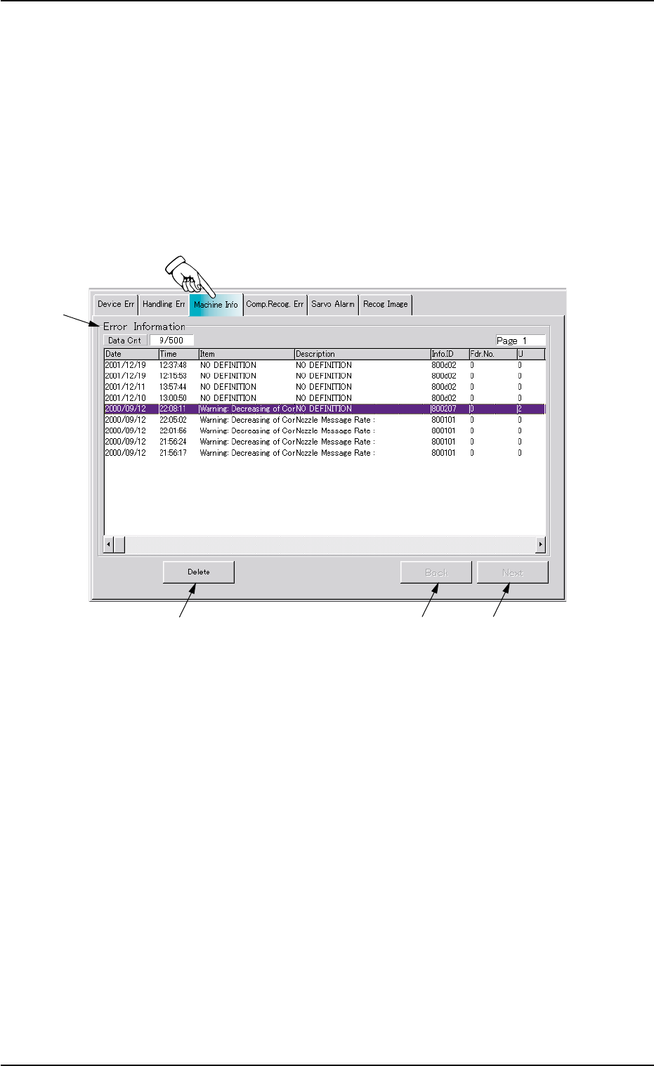 AHB01ESPP 6 . 3 "Machine Info" T ab The corresponding tab sheet enables the operator to check the date & time of message issuance, device status, information IDs, the contents of messages, and user names. •…