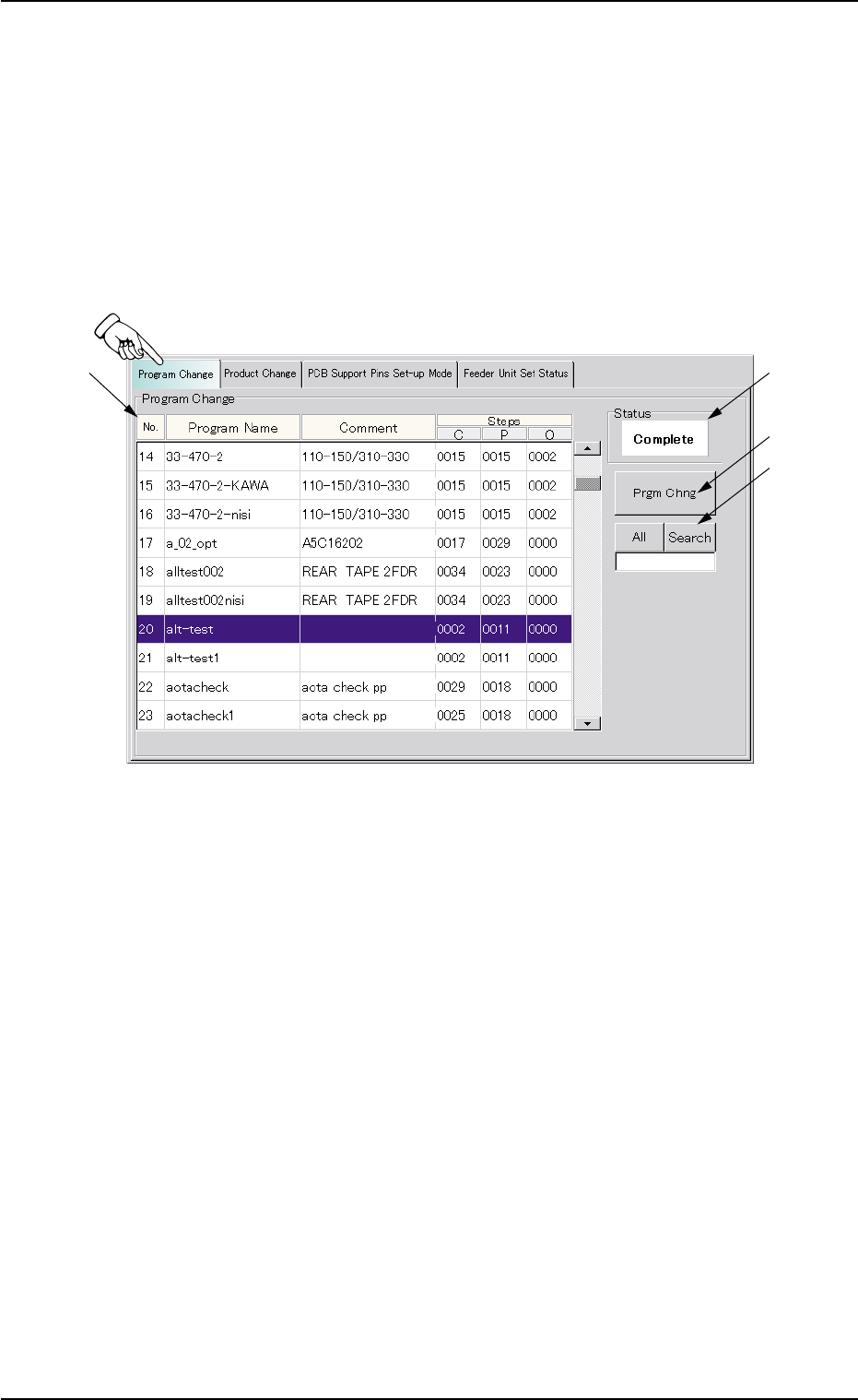 AHB01ESPP 0308-004 5-41 7. "PRGM. CHG." Window (Submenu) • • • • • Window Layout When the [PRGM. CHG.] button on the submenu bar of the "AUTO RUN" window is pressed, the following window (submenu) ope…
