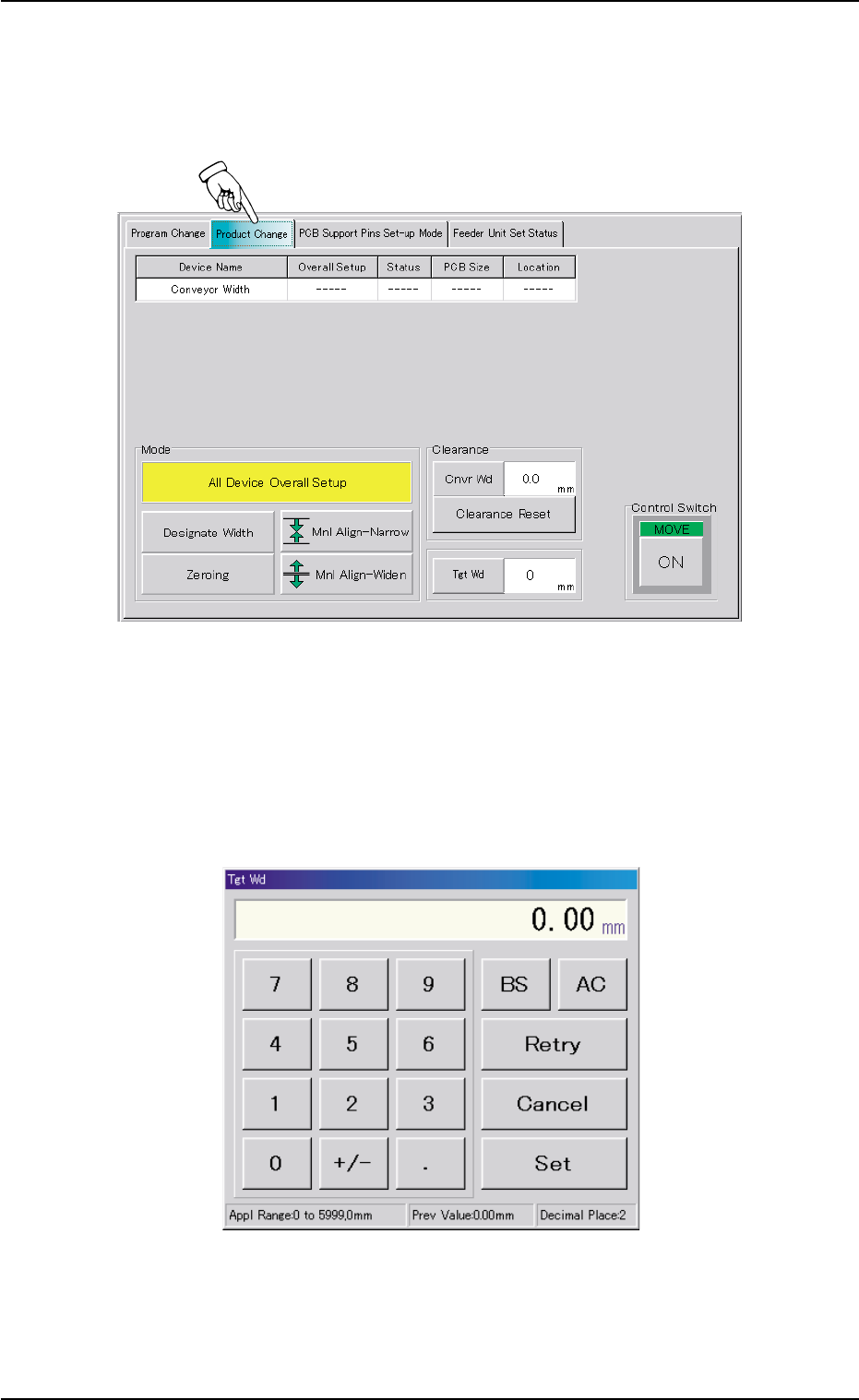 AHB01ESPP (2) Select the [ON] button (entitled "MOVE") and press the [ENABLE] button on the operation panel in 2 seconds. The conveyor width is changed to the target one. (3) When the conveyor width must be adj…
