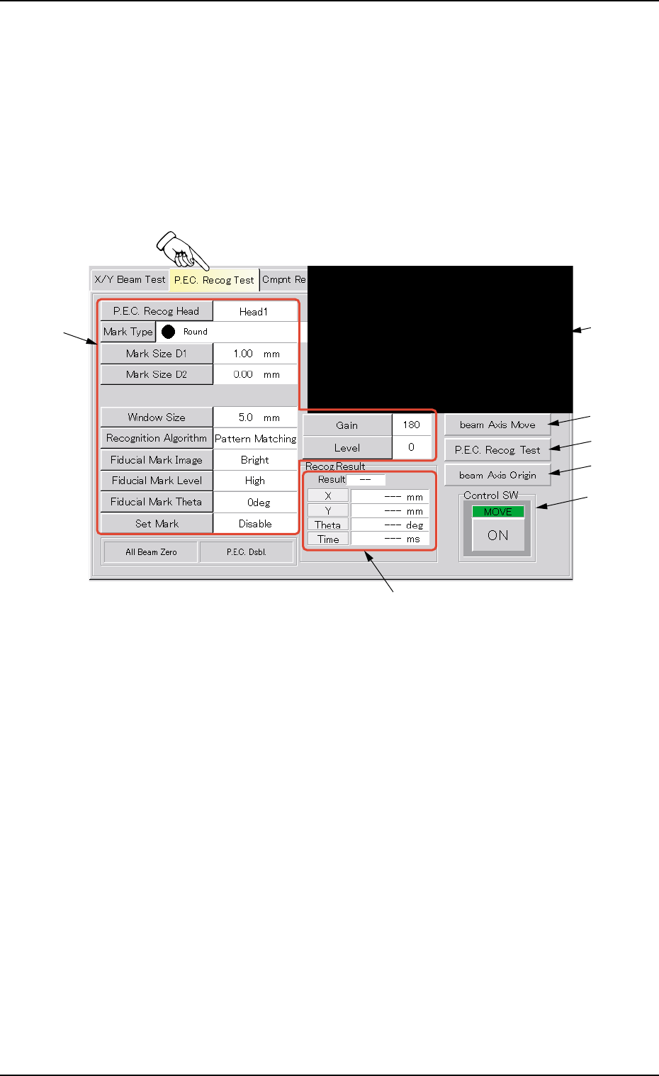 AHB01ESPP 3 . 2 "P .E.C. Recog T est" T ab The corresponding tab sheet enables the operator to make a test on the P .E.C. recognition (fiducial) marks. • Sheet Layout When the "P .E.C. Recog T est" ta…