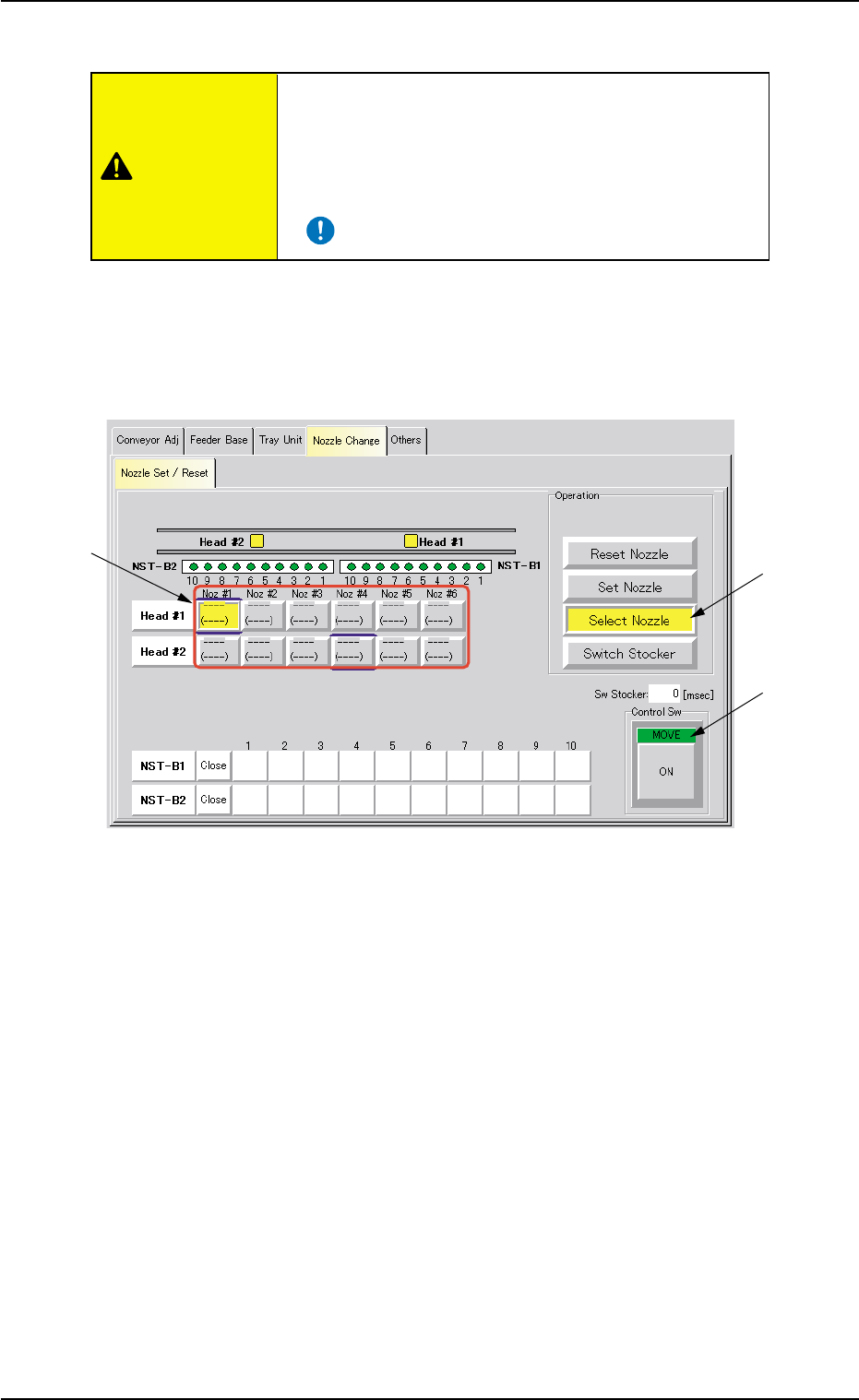 AHB01ESPP • Do not select any nozzle when a component is picked up by the head. Otherwise, the vacuum will be turned off, releas- ing the component from the head. 4.3 "Nozzle Change" T ab *10 *3 *6 0308-003 6-7…