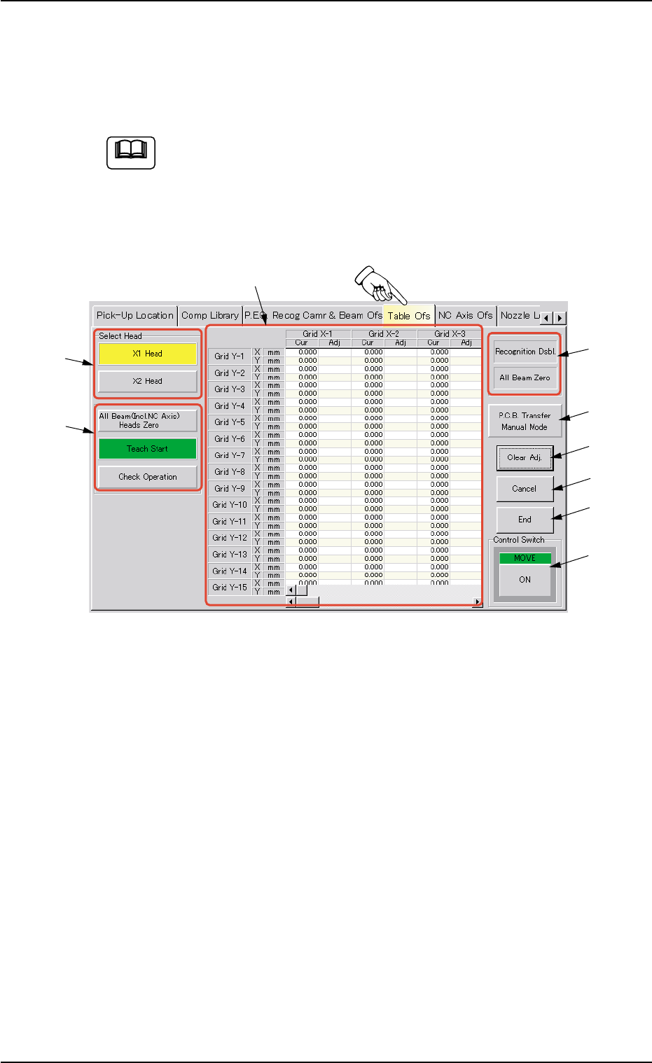 AHB01ESPP 5.4 "T able Ofs" T ab The corresponding tab enables the operator to determine the table off- set data by recognizing the checker marks printed on the jig P .C.B.’s with the P .E.C. recognition camera.…