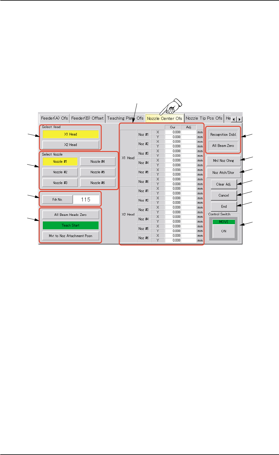 When the "Nozzle Center Ofs" tab is pressed in the "TEACHING" win-