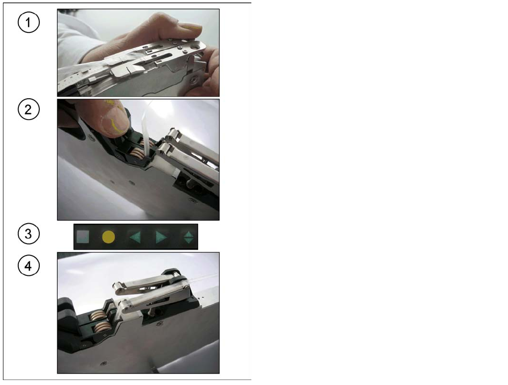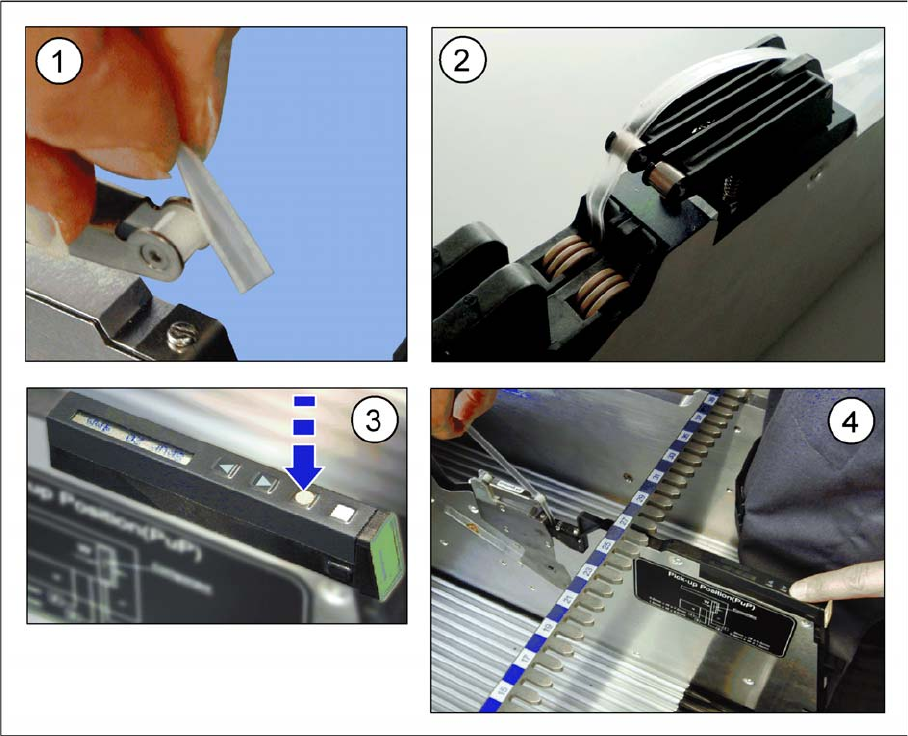 Gurtzuführmodule bedienen Zuführmodul rüsten Umrüsten auf PSA Folie (Pressure Sensitive Adhesive) 60 Bedienungsanleitung X-Zuführ module der SIPLACE-Familie 4.2.5.2 Abdeckfolie an 8 - 88 mm Zuführmodulen einführen ► (1) …