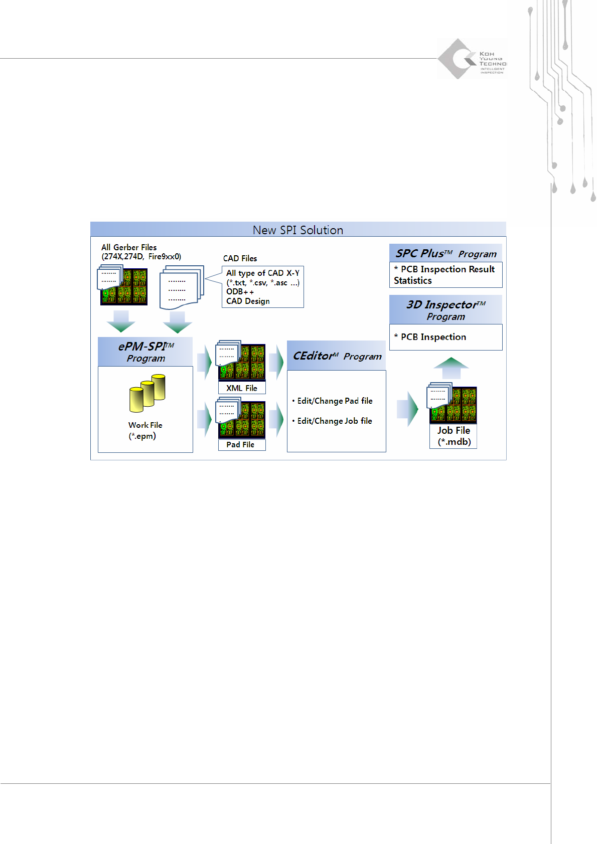 Programmer ’ s Manual | 11 1. ePM-SPI 軟體介紹 ePM-SPI 程式是應用於印刷電路板上檢查銲墊上錫膏的前置程式編輯 軟體. ePM-SPI 軟體可經由取得印 刷鋼板的Gerber(*.gbr) 重新編輯PCB上的銲墊資料(*.pad) 以供檢測之依據. 銲墊資料經由CEditor轉換成Job file (*. mdb) 以提供足夠資訊讓aSpire2系統透過3D 檢測鏡頭擷取錫膏 影 像, 以下…