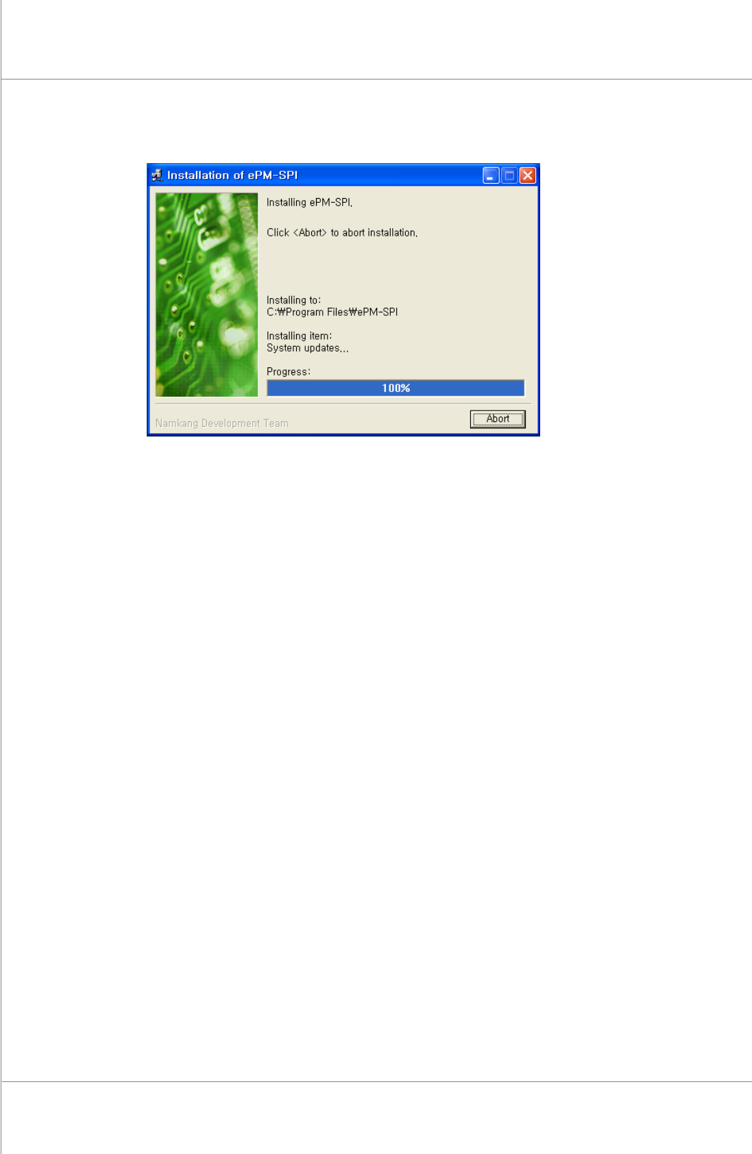14 | Chapter 2. ePM-SPI TM 3D Solder Paste Inspec tion System V ersion 1.0 K OH Y OUNG T ECHNOLOGY . I NC . 5. 當安裝作 業完成時將出現以下視窗, 若您想放棄安裝, 可擊點 " Abort" 按鈕 放棄安裝. Figure 2-5. ePM-SP I Installation Win dow – C…